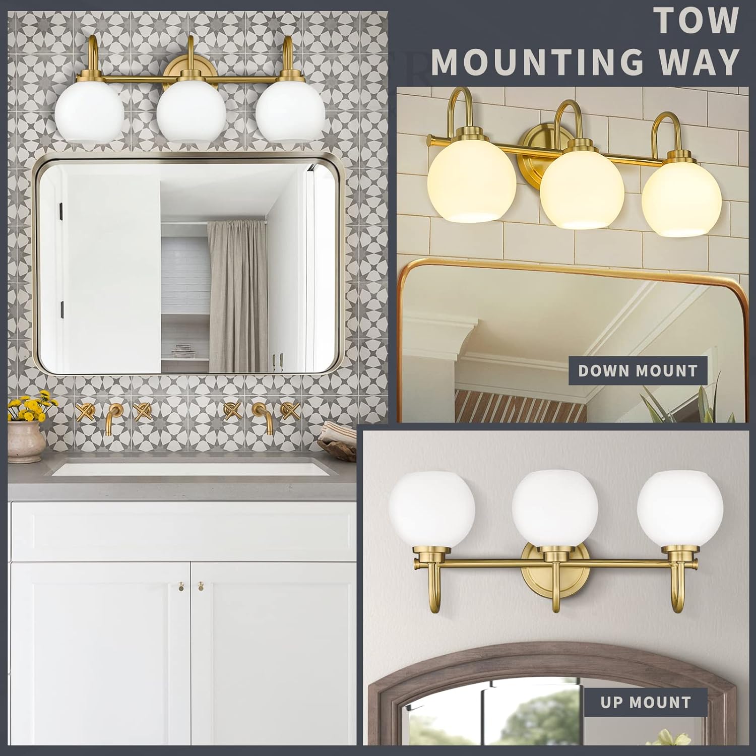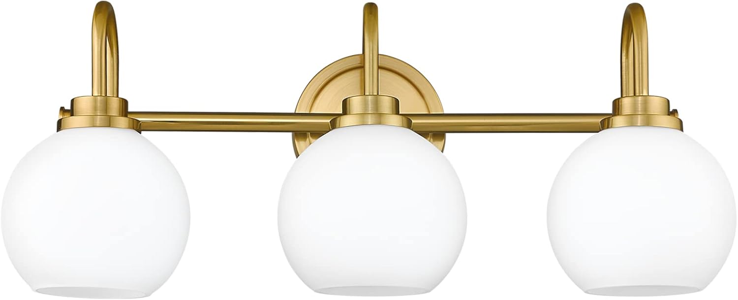 - ELEGANT DESIGN: The brushed gold bathroom light fixtures and premium white etched glass globe ensure rust resistance and long-lasting use. This gold bathroom light fixture is suitable for various design styles from traditional farmhouse to mid-century modern.