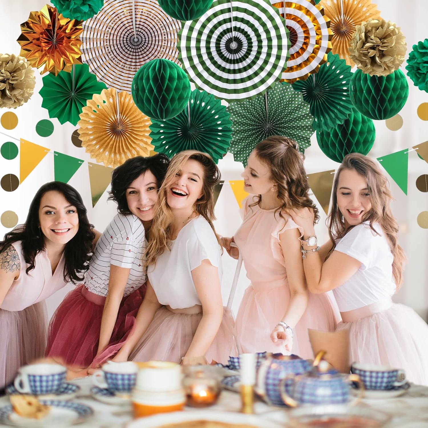 Green and Gold Party Decorations, 23Pcs Hanging Paper Fans, Pom Poms Flowers, Garland String Polka Dot and Triangle Bunting Flag Packs for Girl Birthday Bridal Shower Baby Showers
