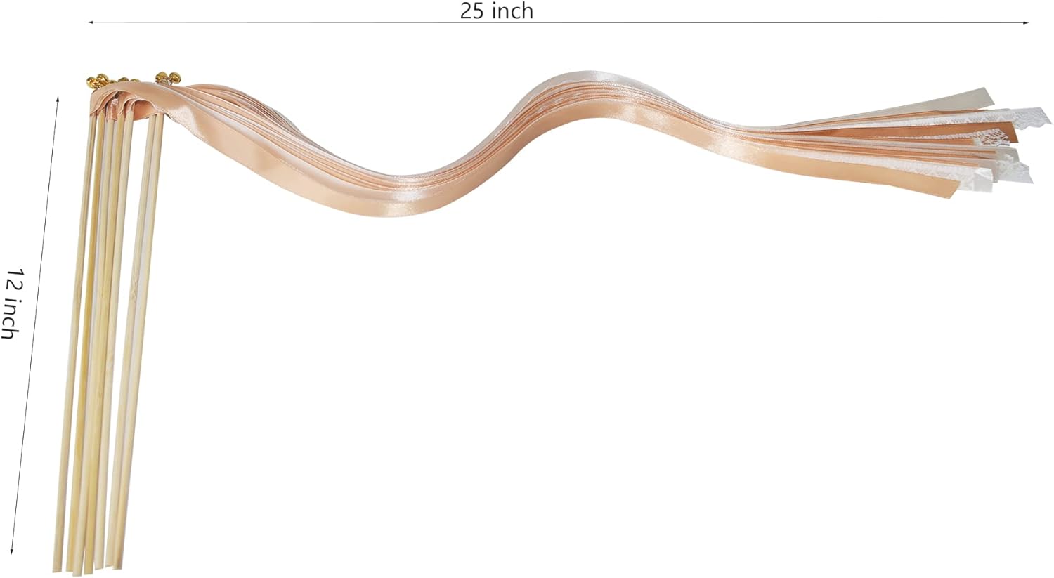 - Champagne Ribbon Lace wands are handmade with high quality satin Champagne ribbon and soft lace. Flowing pieces satin ribbon and lace (24 inch) securely attached to a 12 inch wooden stick and accented with a gold bell. Ends of ribbons are heat sealed to prevent the ends from unraveling. Perfect for flower girls and guests.