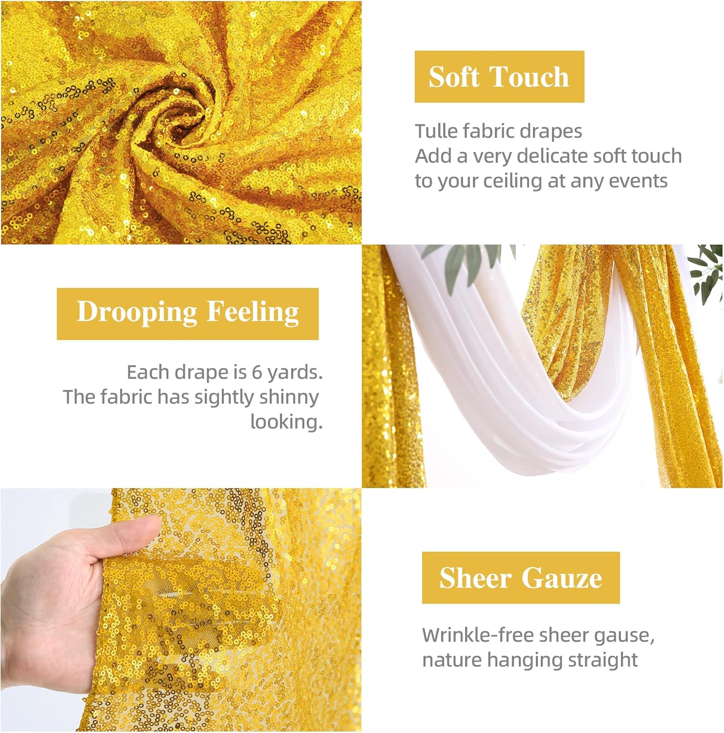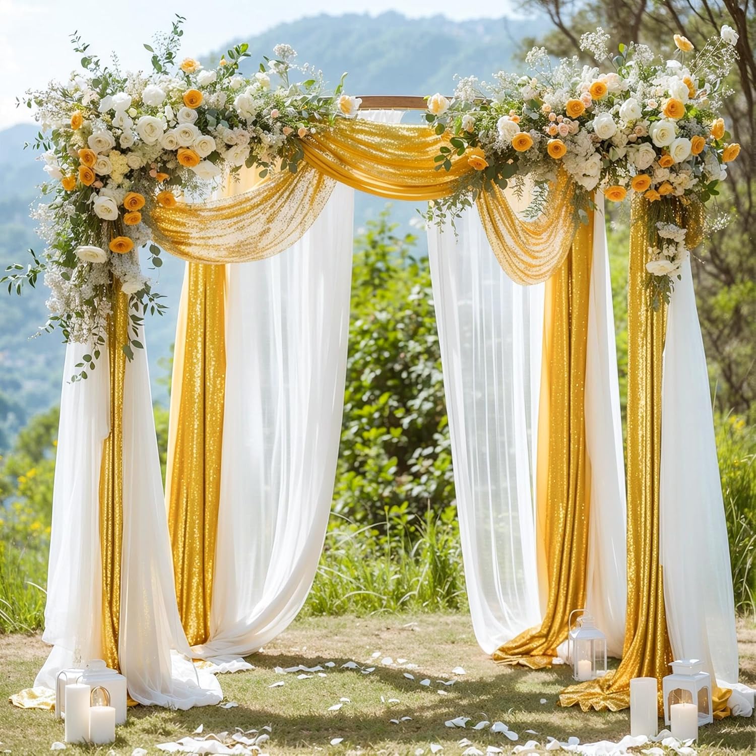 - 【Best Choice Wedding Arch】Package includes 2 panels arch drapes.1 panel white sheer arch drapes size is 28 inches wide and 228 inches long, another gold sequin drapes size is 16 inches wide and 228 inches long. The length is long enough to fit any size arch decoration. Soft and overhanging pendants make the wedding decorations more popular.This sheer drapery backdrop can help your party to create a warm and elegant scenes.