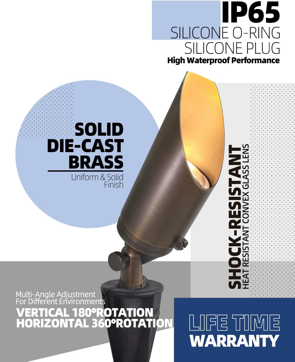 - BRASS LIGHT FIXTURE:MALORY landscape spotlight is constructed of die-cast brass for durability and beauty.Brass spot light doesn't corrode,more durable and reliable than aluminum and plastic fixtures,ideal for any uplighting application.Simple design structure for the light fixture make it looks beautiful yet unobtrusive in any landscape,suitable for decorating most houses and yards.