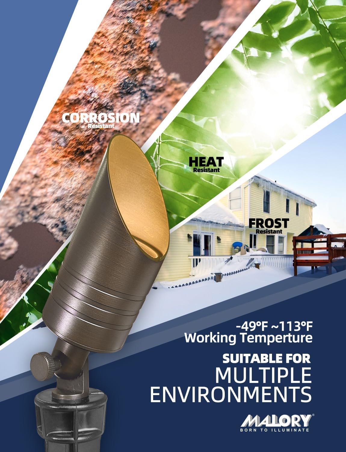 - LIFETIME WARRANTY:MALORY landscape lighting are built to the highest standards of construction and performance, we extends an industry-best lifetime warranty on its brass fixtures and 50,000 hrs for the LED bulbs.Please contact us if you have any issue, we will offer top rated customer service for you.