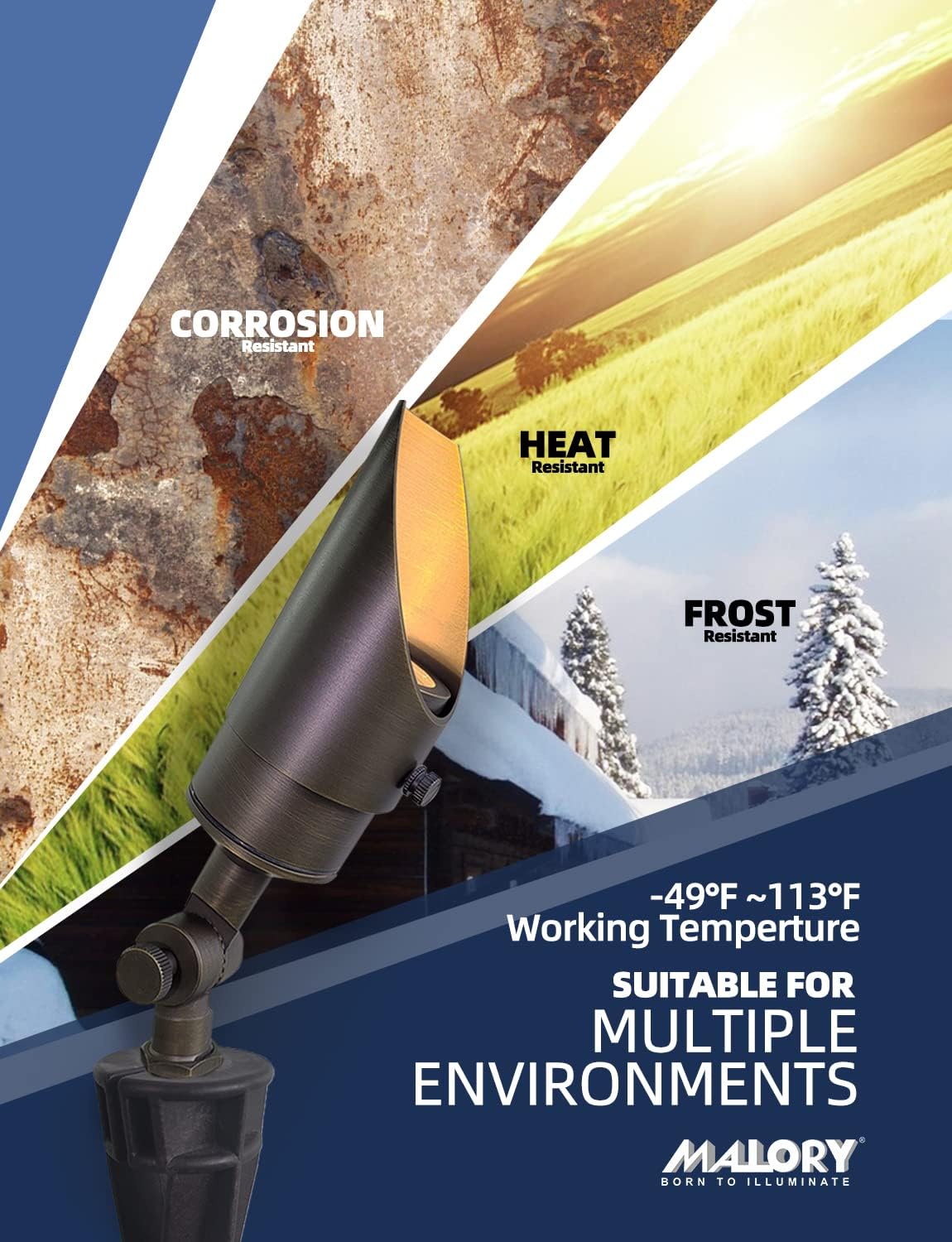 - BRASS LIGHT FIXTURE:MALORY landscape spotlight is constructed of die-cast brass for durability and beauty.Brass spot light doesn't corrode,more durable and reliable than aluminum and plastic fixtures,ideal for any uplighting application.Simple design structure for the light fixture make it looks beautiful yet unobtrusive in any landscape,suitable for decorating most houses and yards.