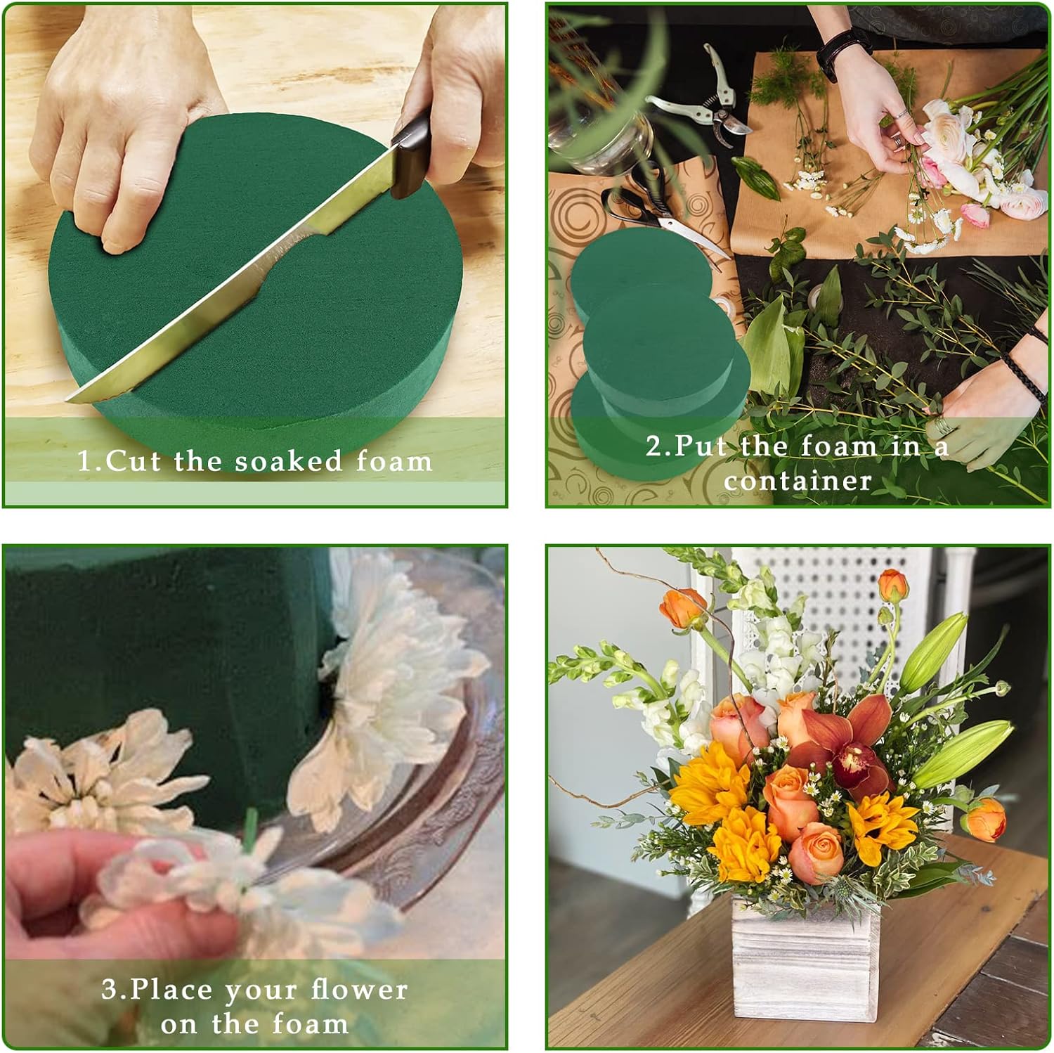 - HOW TO USE--Just soak green foam in water and cut the proper size, then place the fresh or artificial flower on the foam