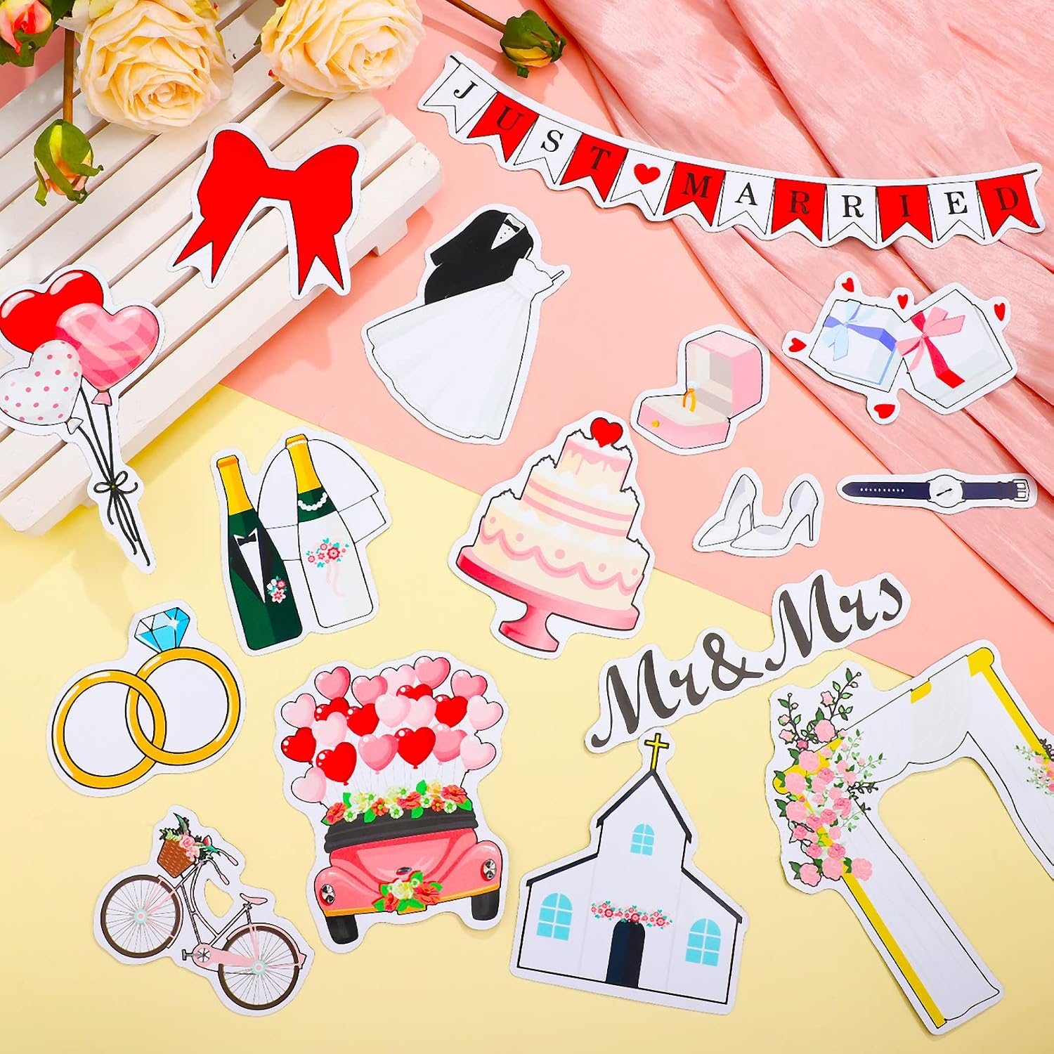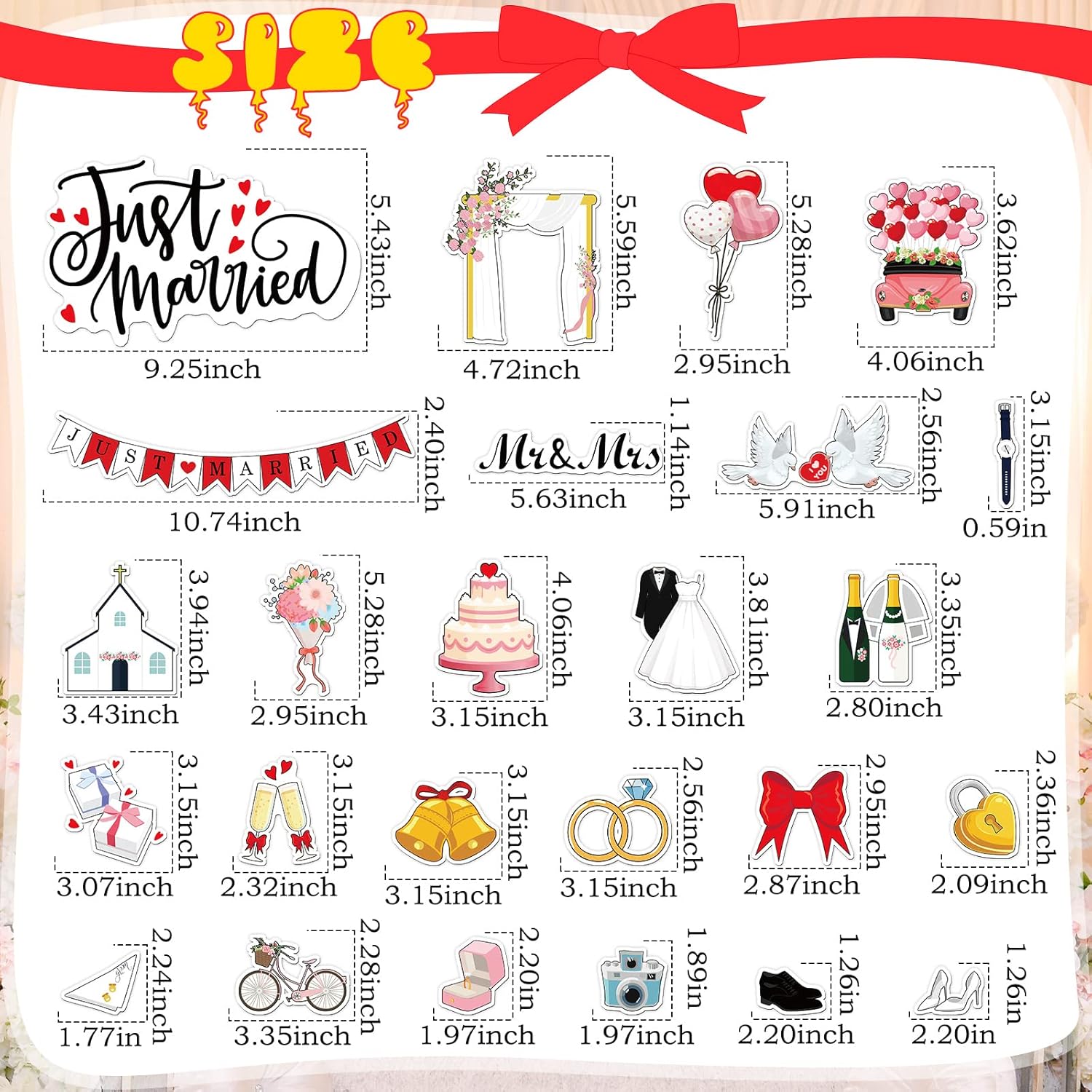 - Just Married Car Decorations: you will receive 25 pieces of wedding decorations for car in total, which comprise 24 pieces of magnets for cars decoration, 1 just married window cling, ideal for your wedding or honeymoon photography and decorations