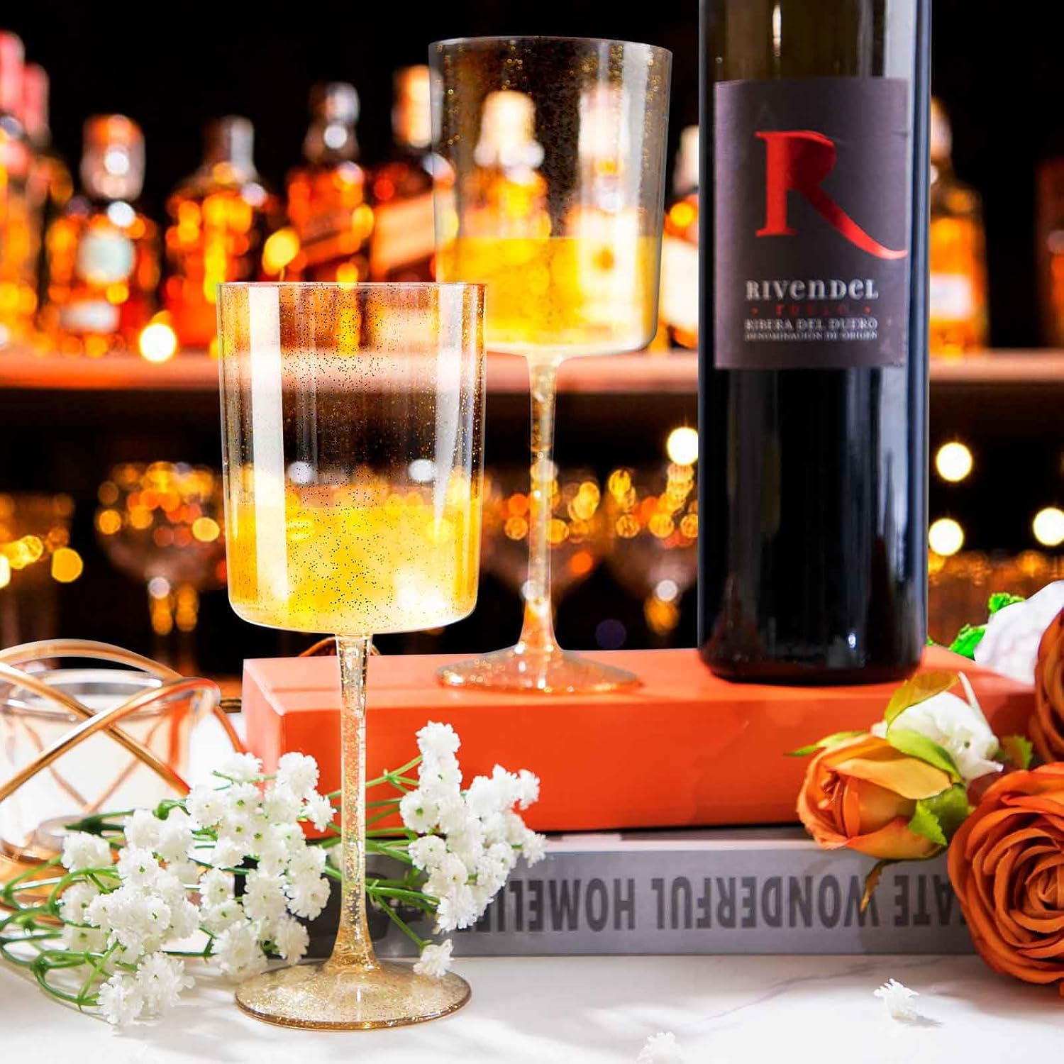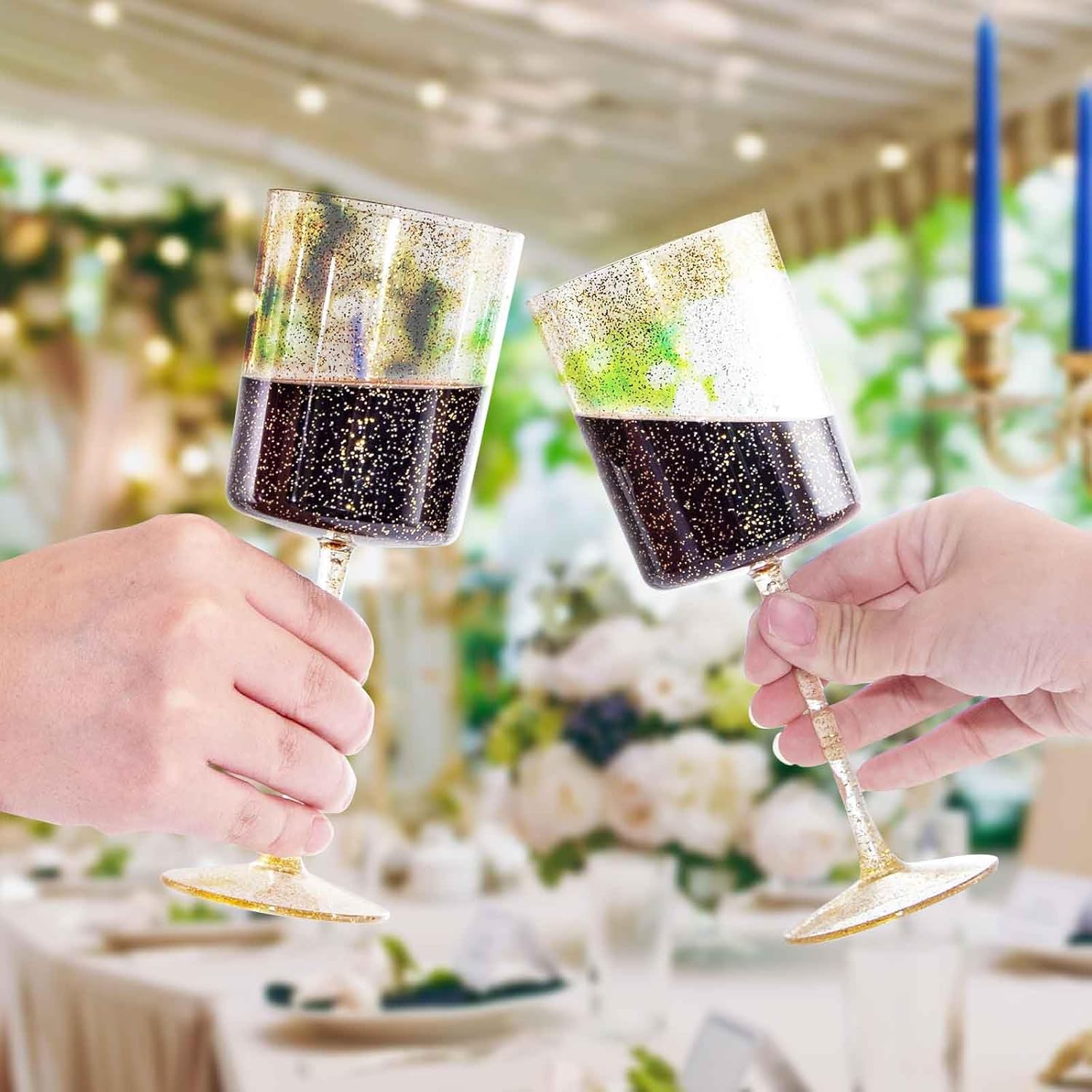 - 🥂Easy Portability:Our gold glitter disposable wine glasses are strong and less likely to break than glass, so everyone at the party can use them safely and securely, and the plastic wine glasses with stem are easy to carry, so picnics can be taken outdoors with confidence.