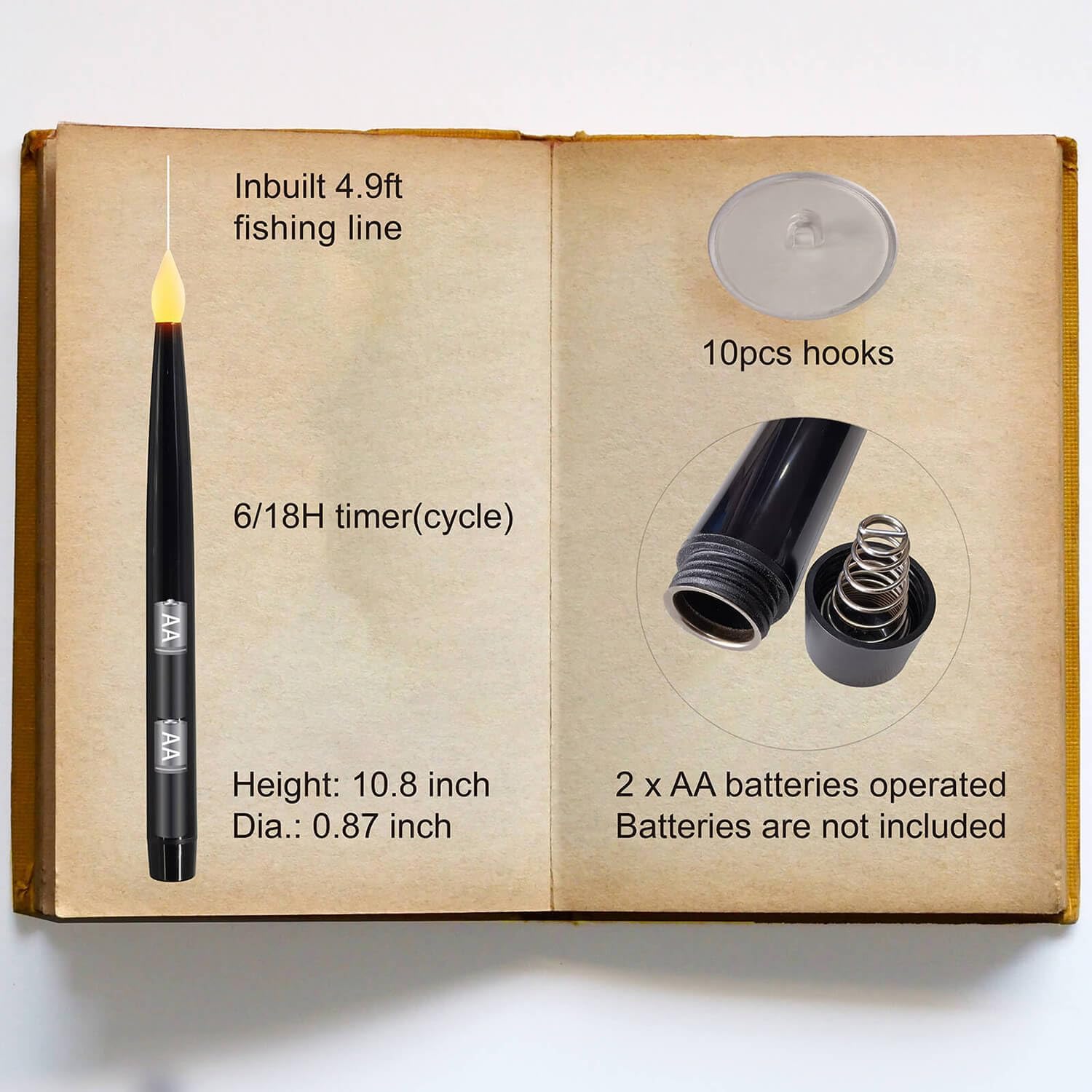 - Package: Each set contains 10 pieces of 0.87"(D)×10.8"(H) LED black candles, 1 plastic magic wand remote control of 14 inches in length, 1 user manual and 10pcs of stick hooks.