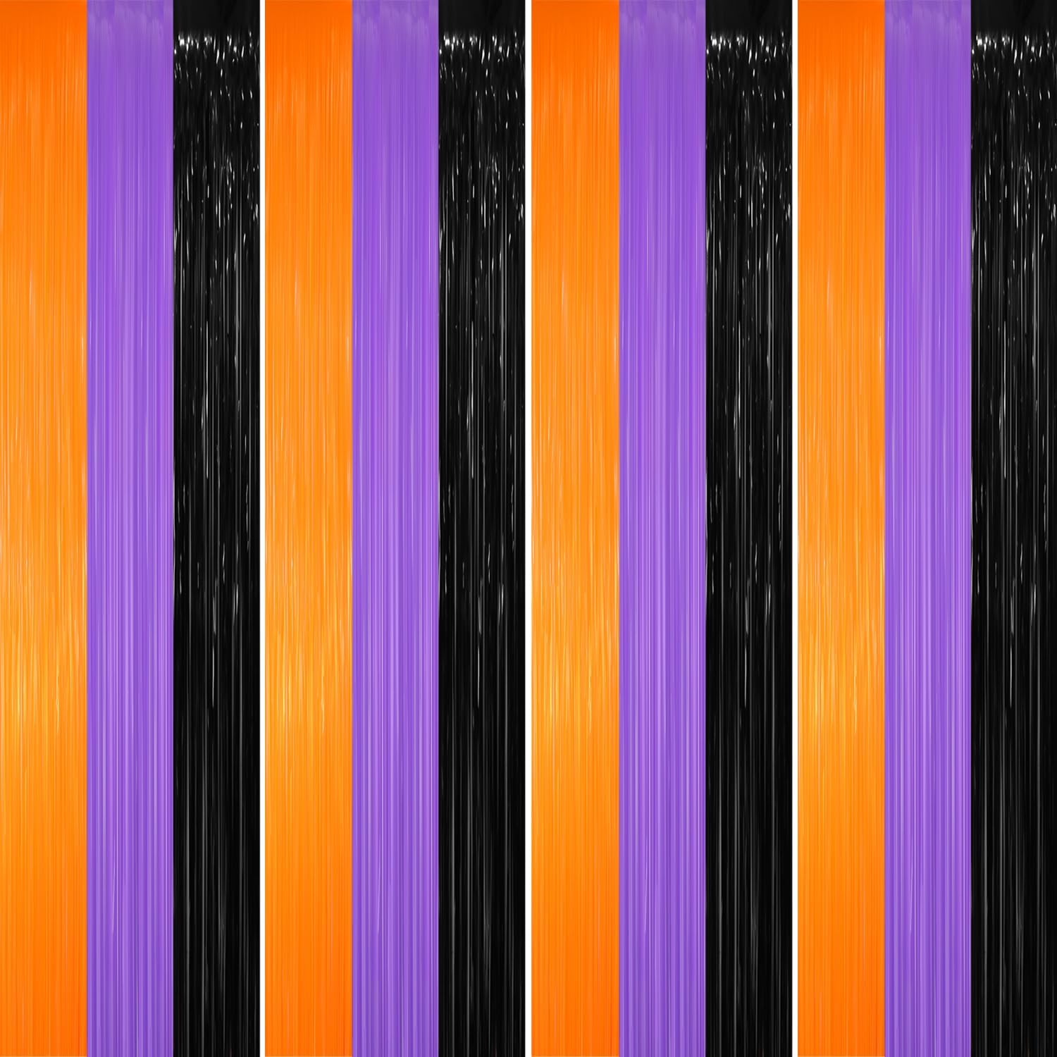 GOER 3.2 ft x 8.2 ft Metallic Tinsel Foil Fringe Party Backdrop for Halloween Birthday Graduation New Year's Party Decorations(4 Packs,Black&Orange&Purple)
