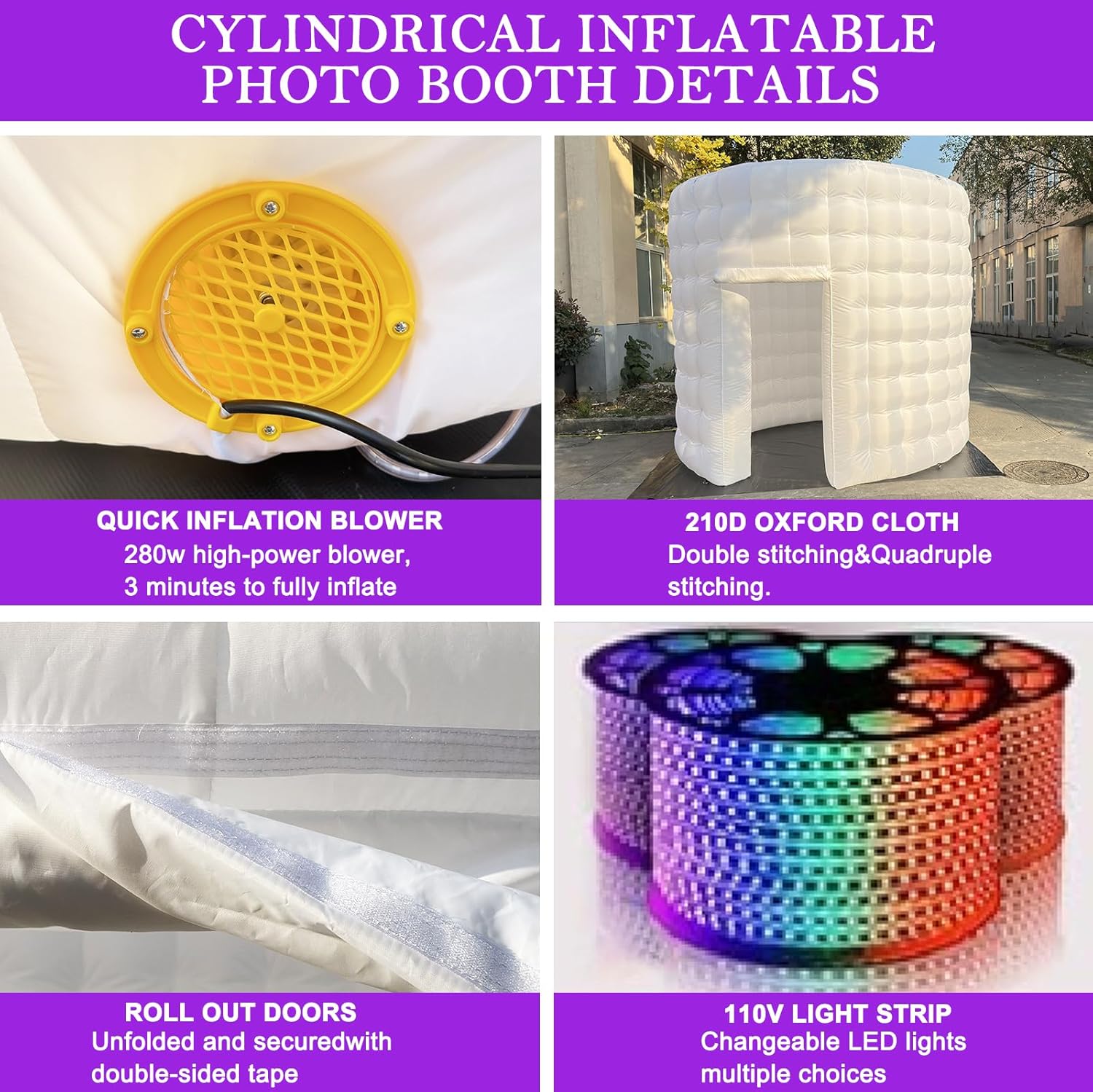 - REUSABLE PHOTO BOOTH TENT: Made of 210D oxford material,doule stitches used inside and outside, quadruple stitching for the stress-bearing parts and the joint parts, apparently more durable.Built-in 280W high-power blower, it only takes 3 minutes to fully inflate, and please unzip the bottom zipper to quickly deflate after use.