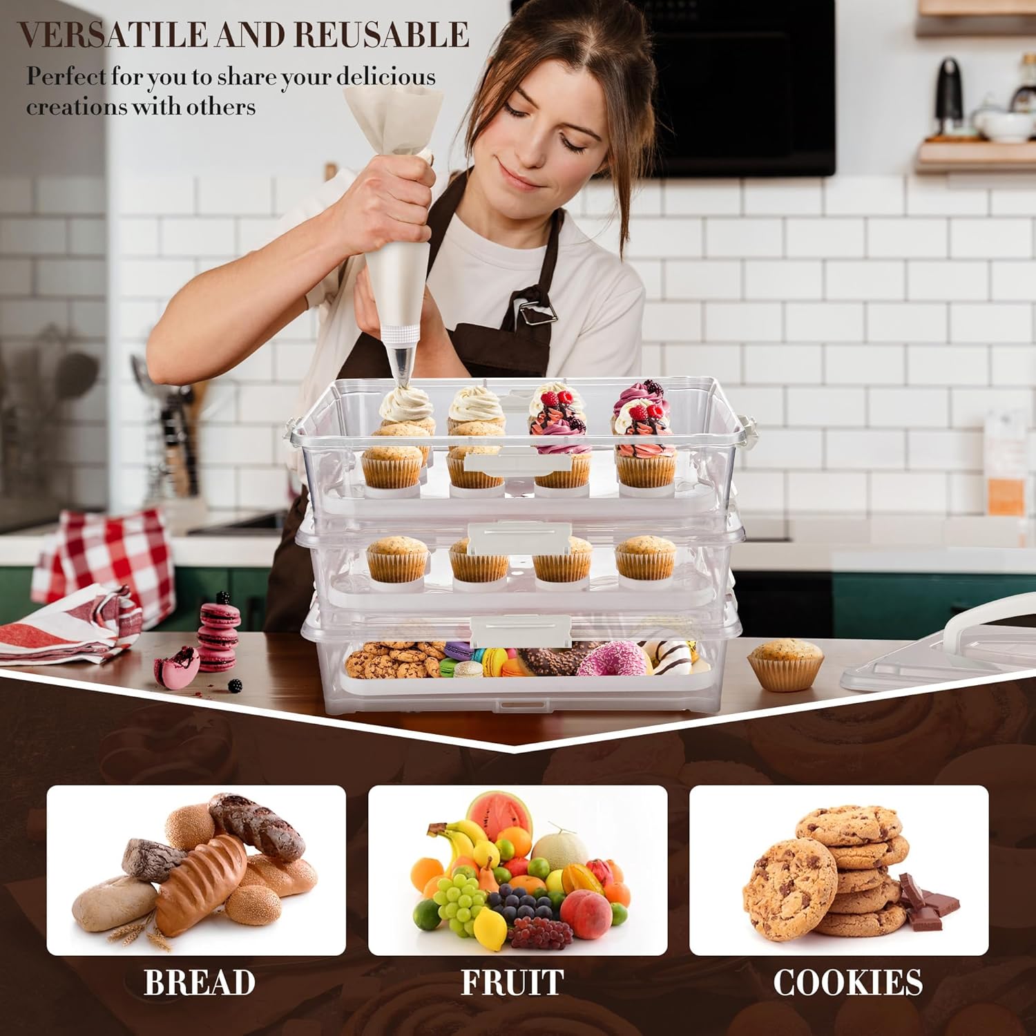 - 🧁 ARC 3-tiers Cupcake Carrier made of safe and durable plastic that is BPA-free, safe for freezer and resists odors in the refrigerator.