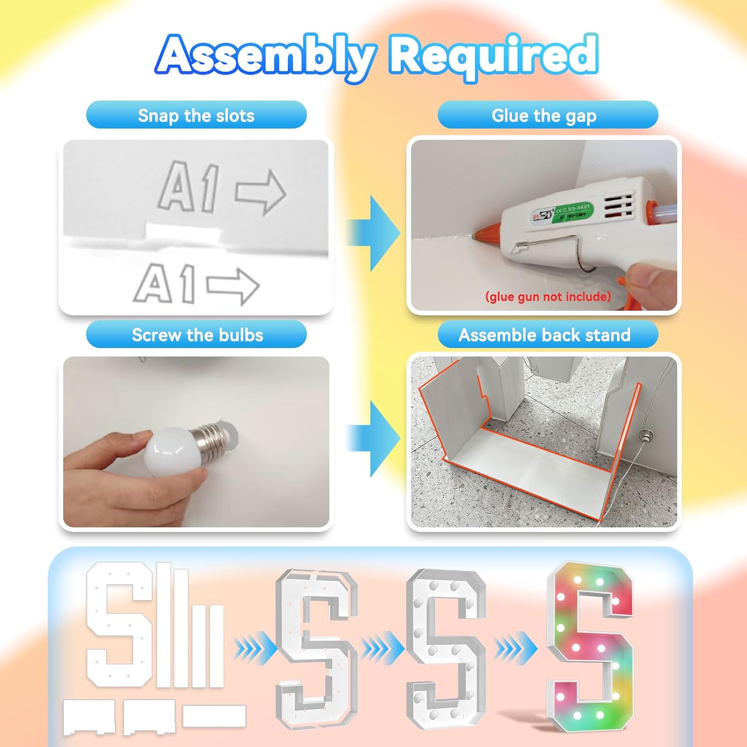 - 【Assembly Required】 4FT Marquee letters are composed of pre-cut foam plates, and also include a remote control, bulbs, and corresponding LED light strings. The product comes with detailed installation instructions and video installation tutorials, making it easy for one person to assemble. When these large light up letters and letters come on, your party can achieve amazing decorative effects.