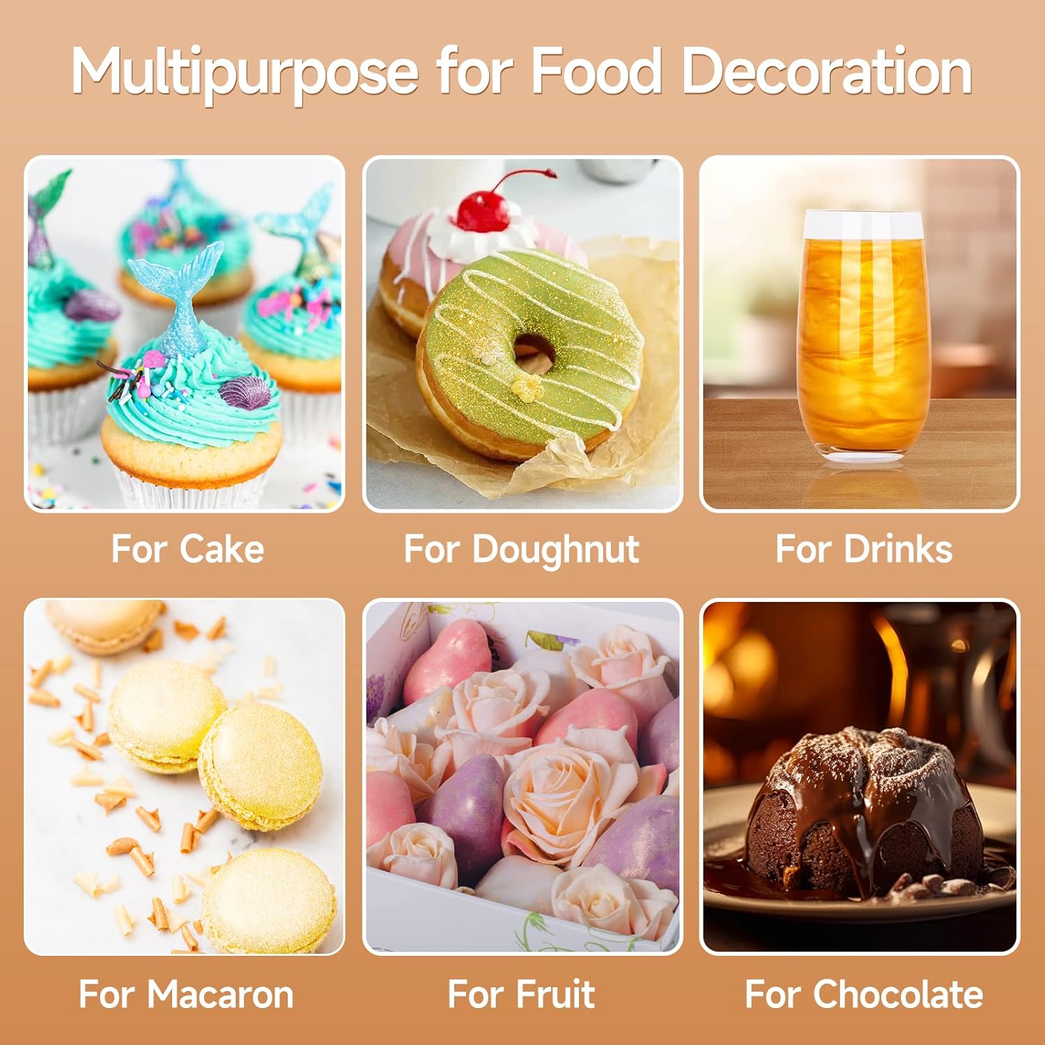 - Safe for Food - Our icing decorating shimmer dust is made with food-grade ingredients, free from sugar and spices. It's gluten-free, dairy-free, allergen-free and vegan, providing vibrant shining and coloring effects for all types of applications without altering the taste or texture.