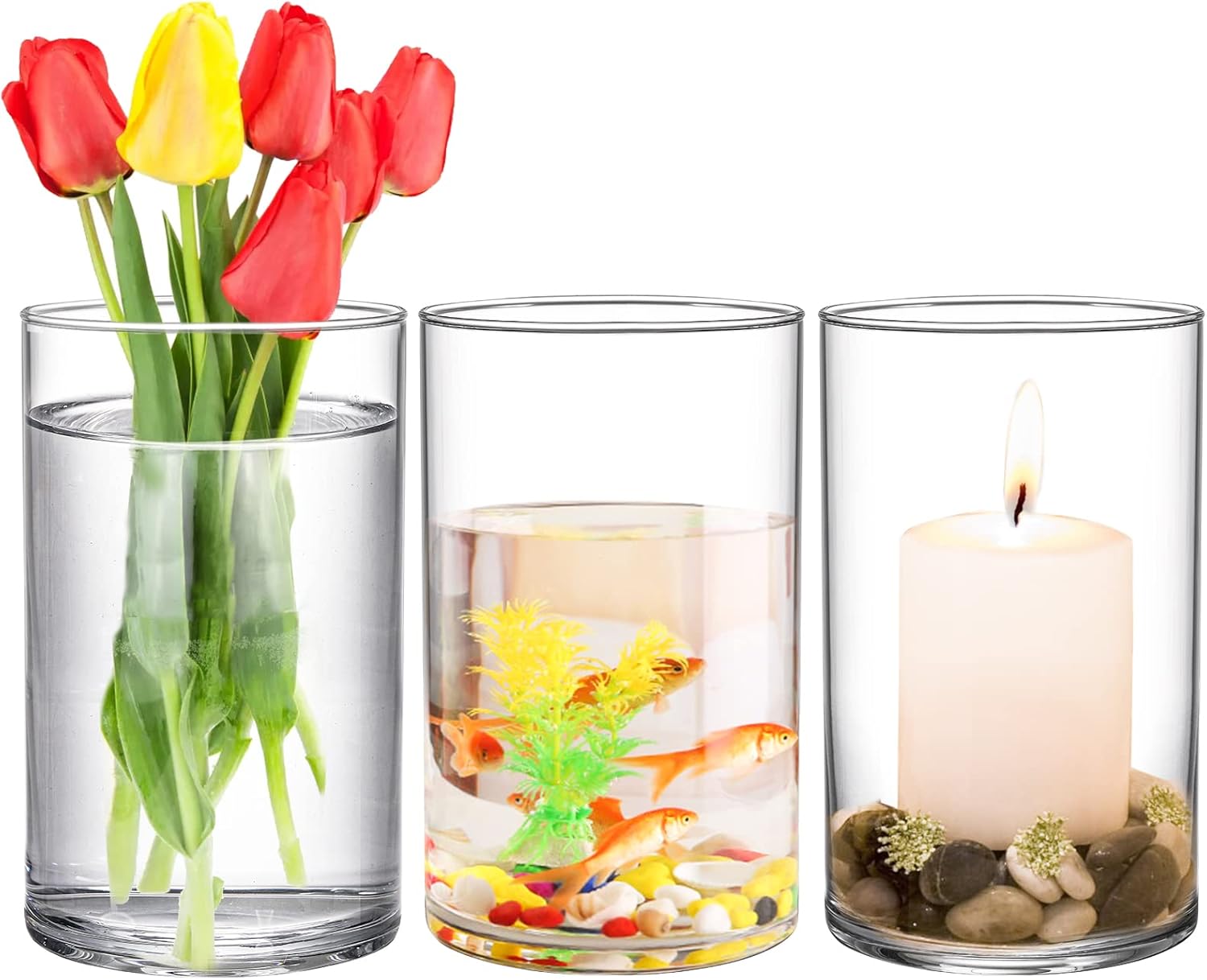 - Widely Used: These round glass vase can not only use as flowers vase decor, transparent cylindrical appearance can also be a pillar candles holder or floating candles holders and fish jar