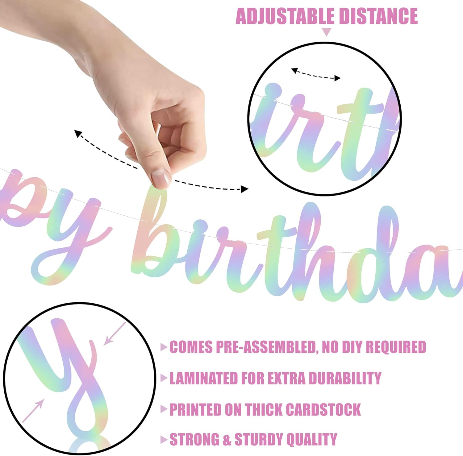 - PRE-STRUNG | READY TO USE | DID WE MENTION NO DIY? : The smooth shiny surface Pre-strung happy birthday banner iridescent, ocean birthday banner, summer birthday party decorations is 10 Feet long, can be decorated with ease as there is NO DIY required and can be attached and detached easily from your walls. The Holographic Birthday Banner for holographic birthday decorations. Each card is tightly locked at the ends for the Pre strung happy birthday banner white. Take a look at our pastel happy birthday banner for unicorn decorations for birthday party.