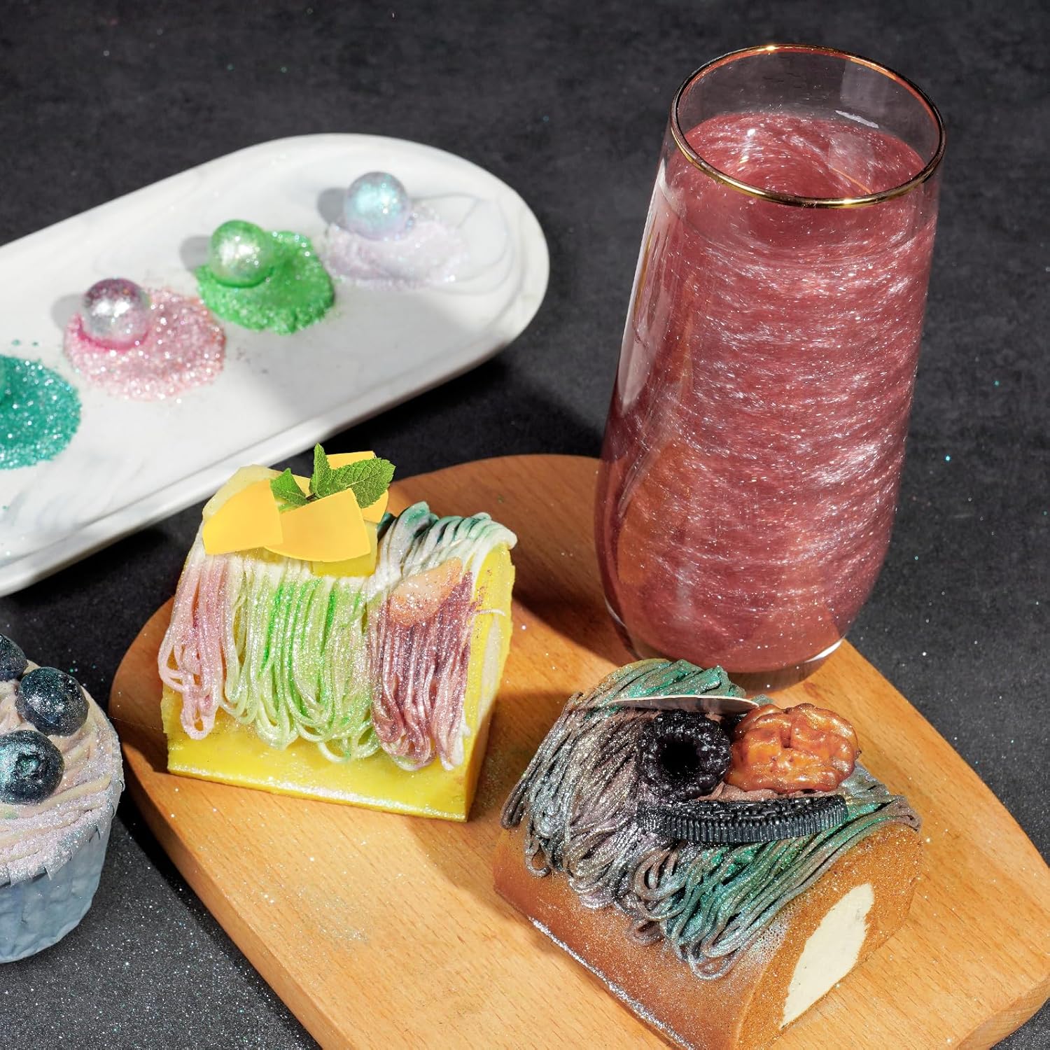 - ✔️【Easy to Use】Specially developed for food decoration and craft industries, this luster dust produces realistic looks by highly pigmented colors with a metallic finish. The pretty fine grain is more convenient for painting. To add glimmer and sparkle to your creations, simply sprinkle or dry brush the luster glitters on them. This product adheres very well to both wet and dry mediums. Attention: Seal and store glitter powder in a cool and dry place after use. Do not expose to excessive heat.