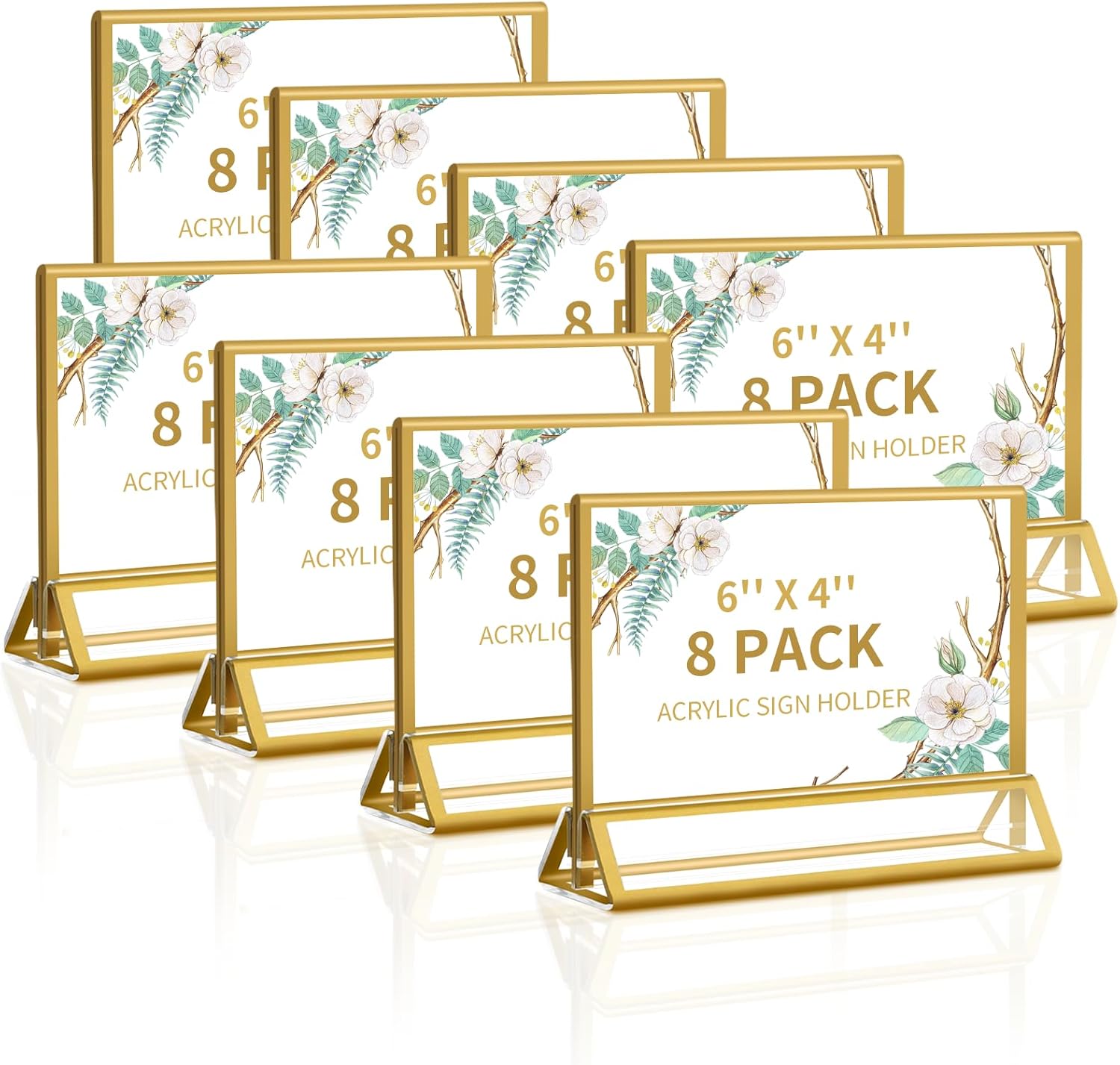 Smarpau 6x4 Gold Acrylic Sign Holder, 8 Pack Wedding Table Number Holders with Horizontal Stand, Double Sided Photo Picture Frames Stands, Flyer Stand, Paper Display Stand for Cafe, Restaurant