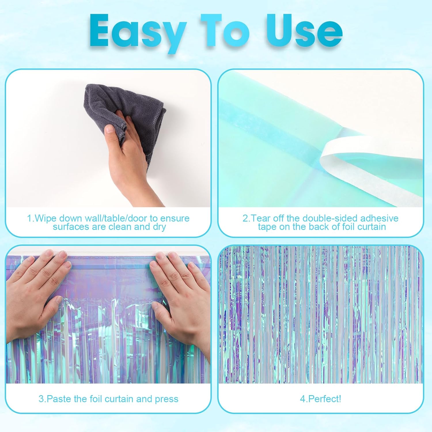 - Package Included: 3 packs of foil fringe curtains, the size of the foil curtain is 3.3*8.2 ft. It's long enough to fit any occasion. Please do not stick the foil curtain on uneven or stained walls to prevent it from falling off