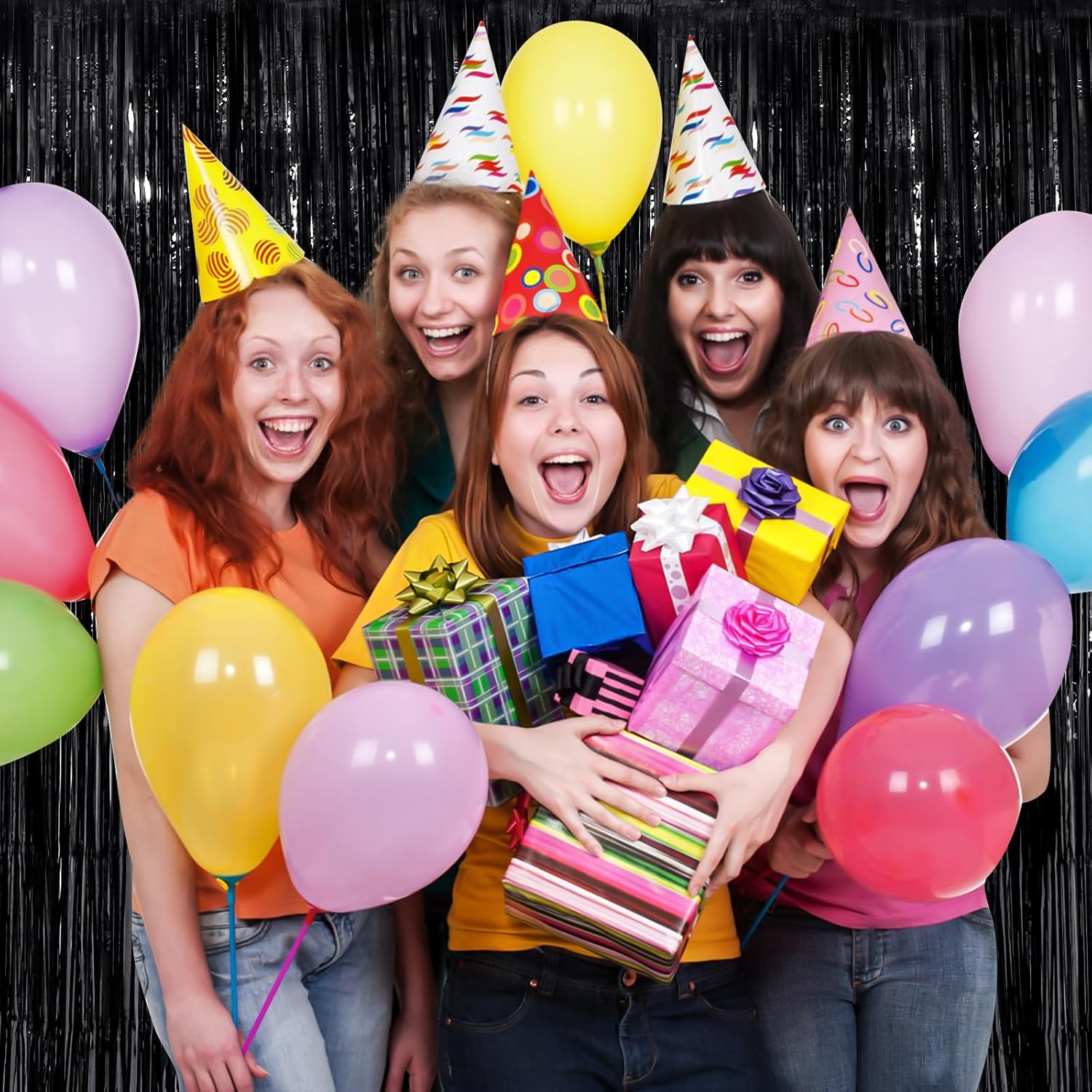 - Party Streamers . This sparkling tinsel Rainbow fringe curtain is Large Size of 8.3X3.3 feet, PET film material, 2Packs, Made of aluminium foil, not easy to tear, reusable. invite guests' attention a nice prop to form a backdrop take photos, suitable for children's adults' birthday party decors, grandparents' birthday, friends surprising party and so on. great Black Red tinsel backdrop for Rainbow bachelorette party decorations or easter decorations mom and dad's wedding