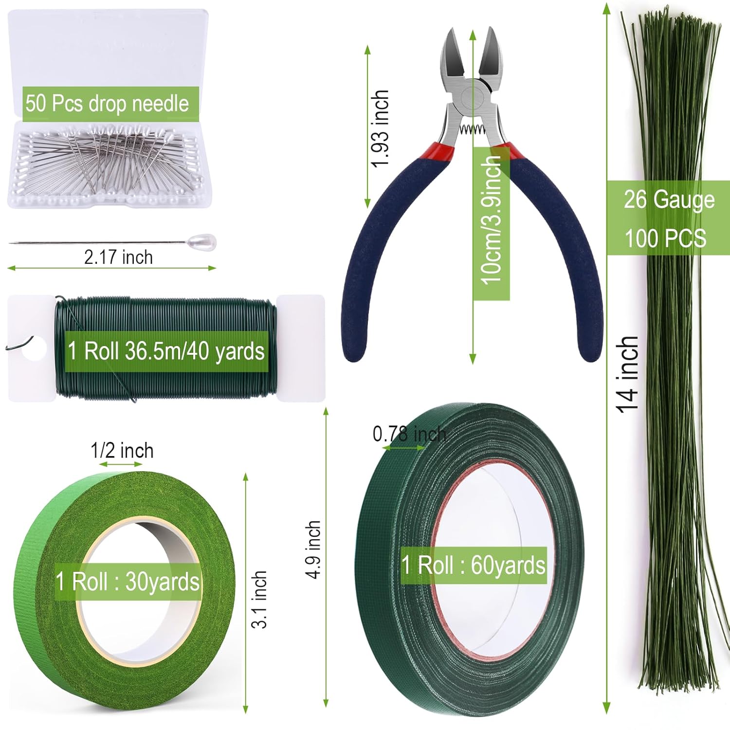 - Everything You Need: Our floral arrangement kit includes 100pcs of 26 gauge green stem wire, 40 yard 22 gauge green paddle wire, 4 rolls of different kind floral tape, 50pcs corsage boutonniere pins, and 1 pair of wire cutters. All the supplies you need for beautiful DIY flower arrangements!