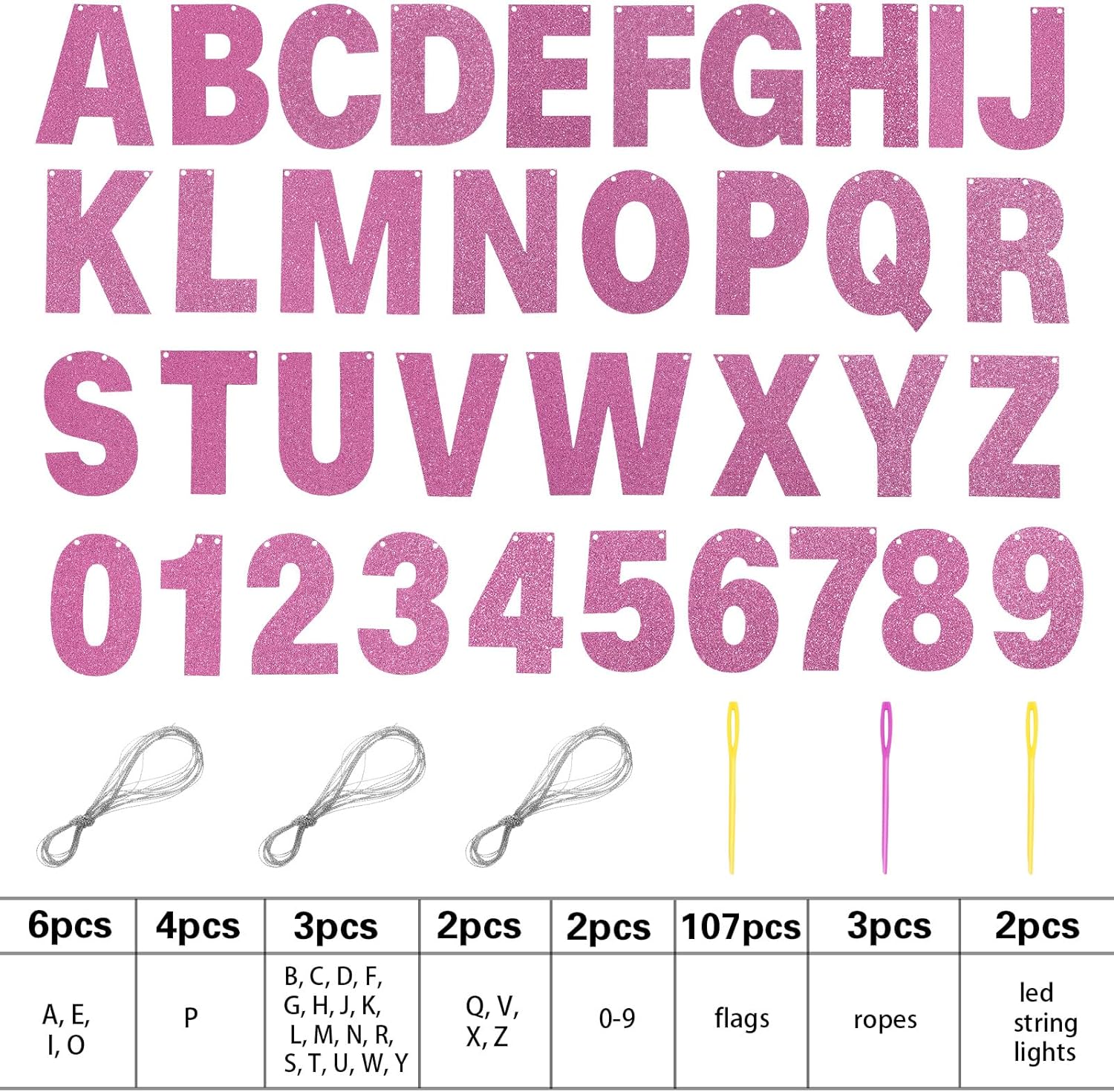 TaoBary 112 Pcs DIY Letter Custom Banner Glitter Customizable Banner Kit Including 107 Letters and Numbers 3 Rope for Valentine Birthday Party(Pink)