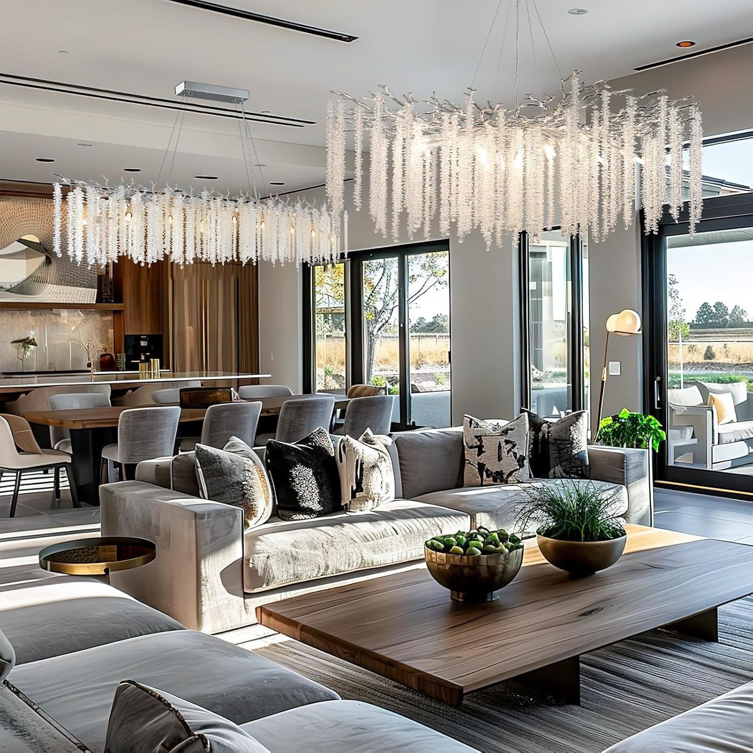 YUYI Modern Crystal Chandelier, 60" Silver Tree Branch Chandelier for Dining Room, Large Rectangular, Luxury High Ceiling Light Fixture for Living Room, Kitchen, Foyer