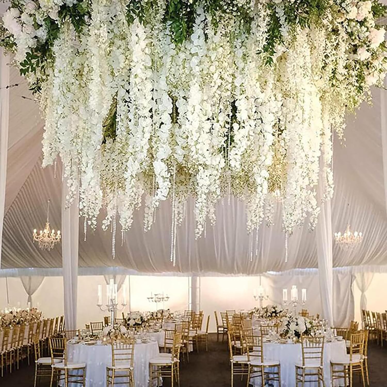 - 【Easy to Install】The white wisteria hanging flowers garland stem is made of durable metal wire and covered with plastic. You can bend the wisteria flower in any shape to satisfy your decoration imagination without damaging it. And the wisteria flower is very easy to install and remove, you can reduce a lot of troubles on installation.