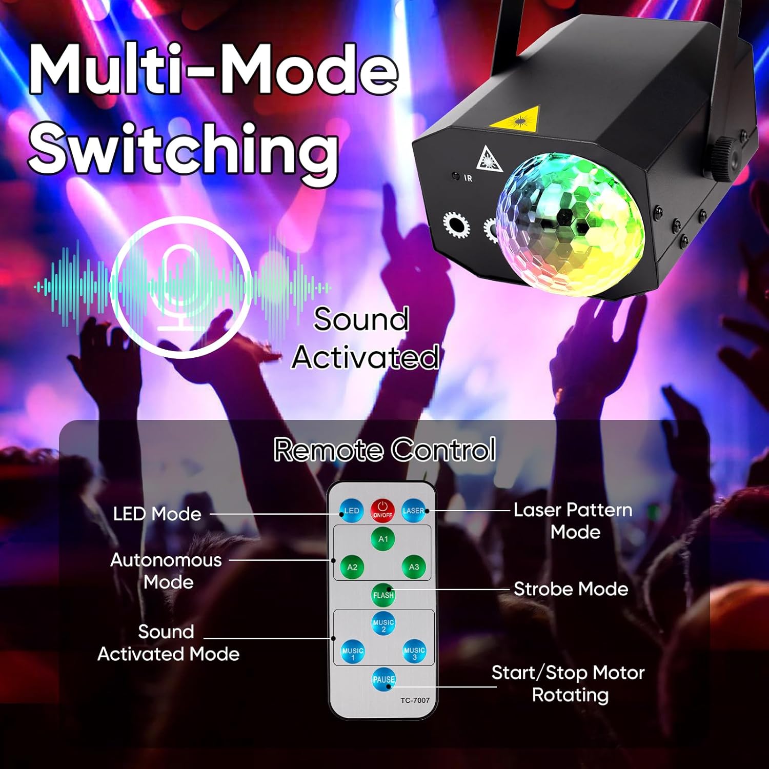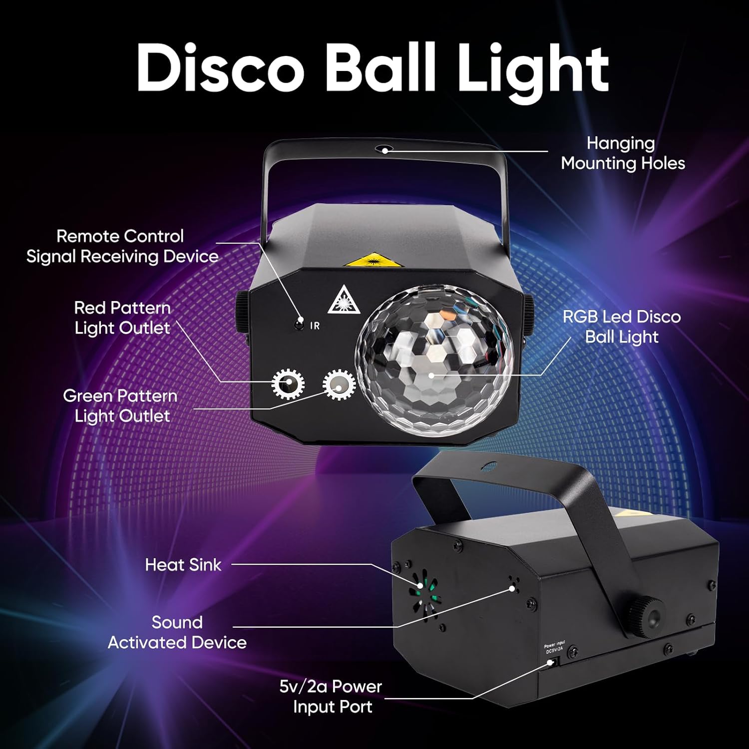 - Multi-Mode DJ Lights with Remote Control: Equipped with 5 working modes—strobe, auto, sound control, laser, and LED—this disco ball light is the ultimate party lights outdoor solution; Control your favorite laser party light setup from up to 50 feet away; Its responsive sound sensor syncs to your music, making it ideal for disco lights for parties and immersive stage laser lights experiences