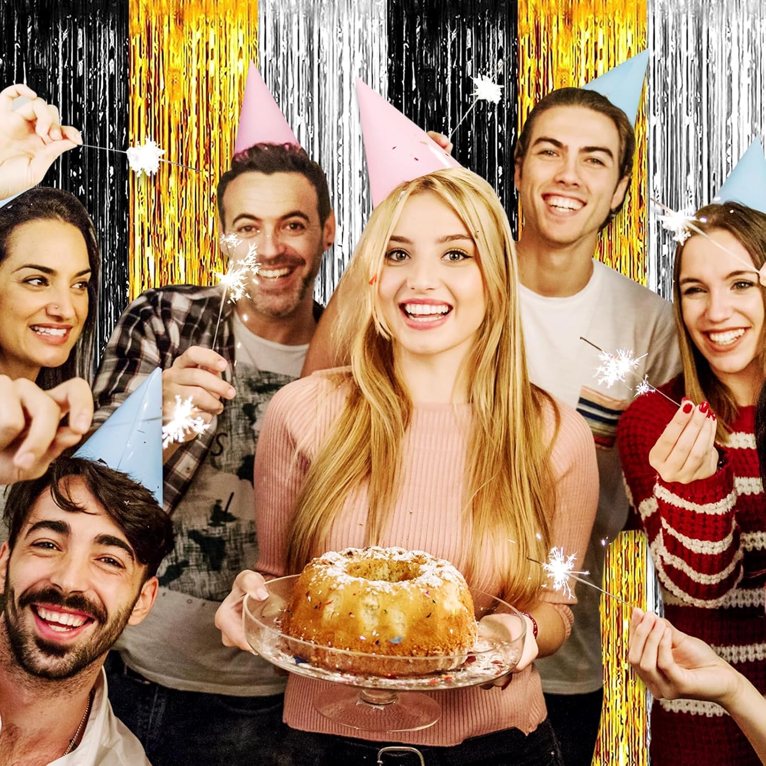 3 Pack Black Gold Silver Foil Fringe Curtain Backdrop, 3.28Ft x 8.2Ft Metallic Tinsel Foil Fringe Streamer Curtains for Photo Booth, Christmas Day, Thanksgiving, Wedding, New Year Party Decorations