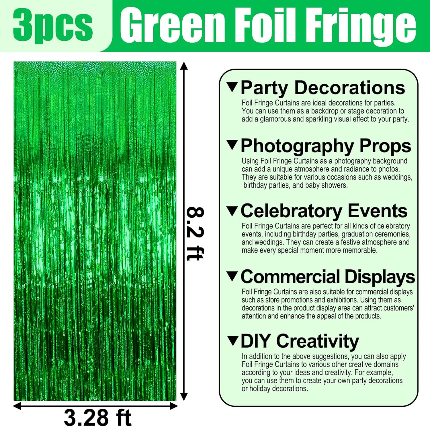3 Pack Green Foil Fringe Curtain Backdrop, 3.28Ft x 8.2Ft Metallic Tinsel Foil Fringe Streamer Curtains for Photo Booth, Mother's Day, Easter, Birthday, Wedding Party Decorations