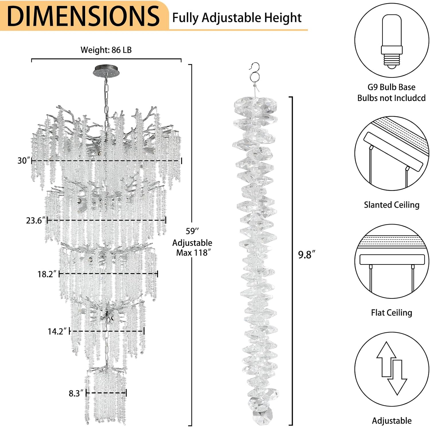 - 【Luxury Crystal Chandelier】This 28-light silver crystal chandelier for the high-ceilinged foyer entrance draws inspiration from nature, designed to resemble lush tree branches. It sparkles and exudes luxury, symbolizing abundance in love, career, family, and friendship. The chandelier features exquisite meticulously crafted from 100% transparent K9 crystal, offering purity and romance, shimmering with diamond-like brilliance. When illuminated, the entire fixture radiates a natural artistic beauty