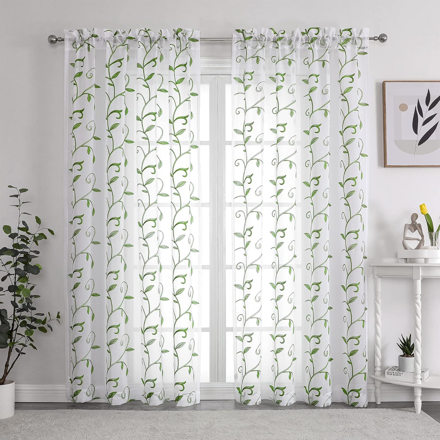 VISIONTEX Embroidered Green Sheer Voile Curtains, Leaves Embroidery Faux Linen Rod Pocket Window Drapes for Living Room and Girls Bedroom 54 x 108 Inch, Set of 2 Curtain Panels