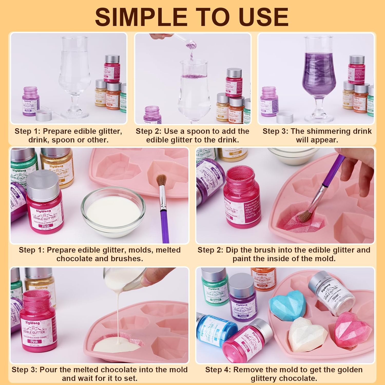 - Widely Used - This edible glitter is versatile and perfect for DIY wine, cocktails, champagne, drinks, beer, soda and more. It can also be used to decorate cakes, cookies, chocolates, macarons, fruit platters, cupcakes, strawberries, lollipops, ice cream and more. Food-grade glitters are so fun, especially when you move it around in the clear glass with a stir, a tiny amount of dust can create a great visual spectacle. Note: Please store these luster powders in a cool,dry place after use and do not expose it to high temperatures.