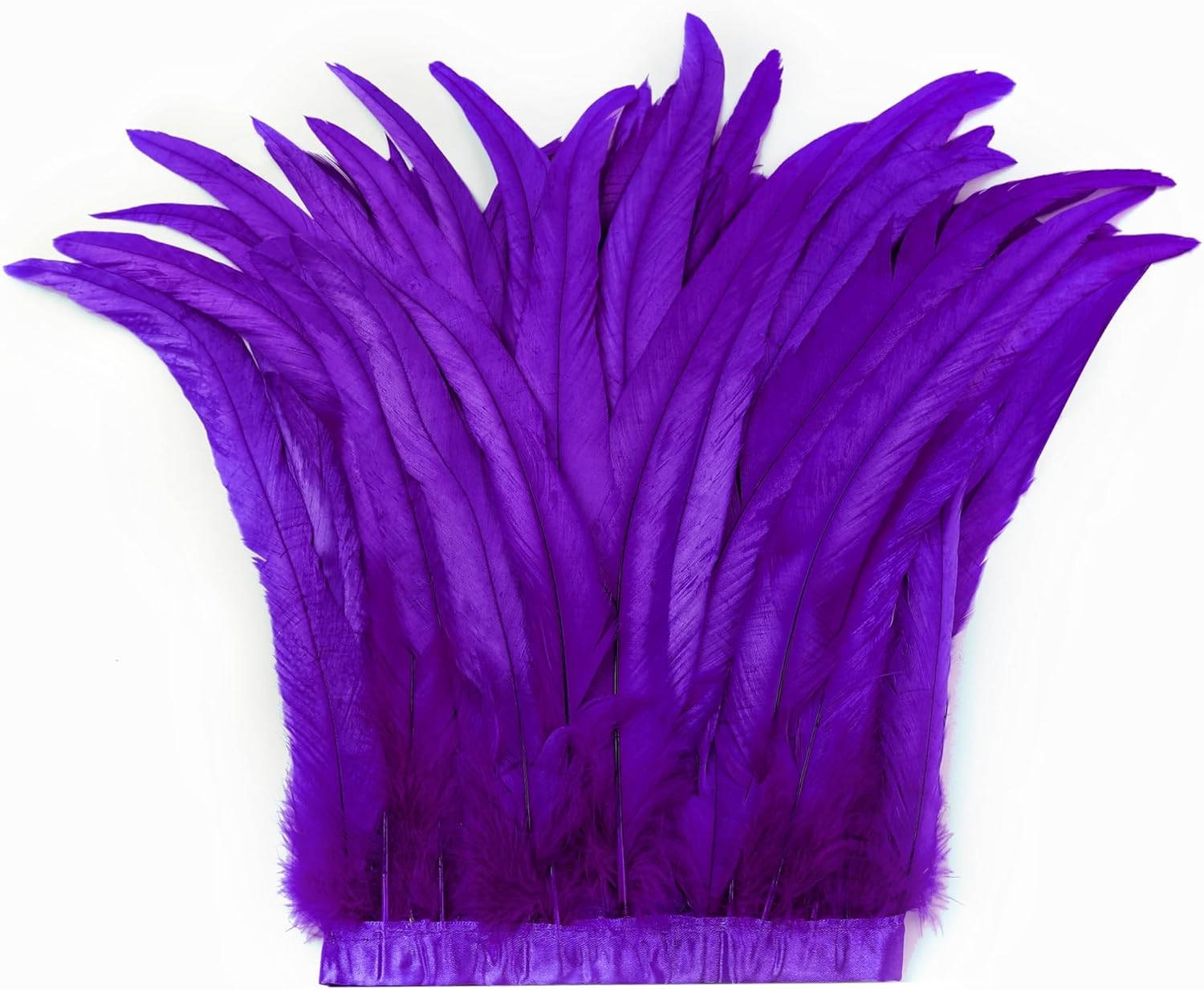 - 10-12 Inch Long Rooster Feathers Trim: A pack of 2 yard 10-12inch (25-30cm) natural purple rooster feathers tail trim. The long rooster tail feather trim will make your unique outfit shine brightly at the theme party
