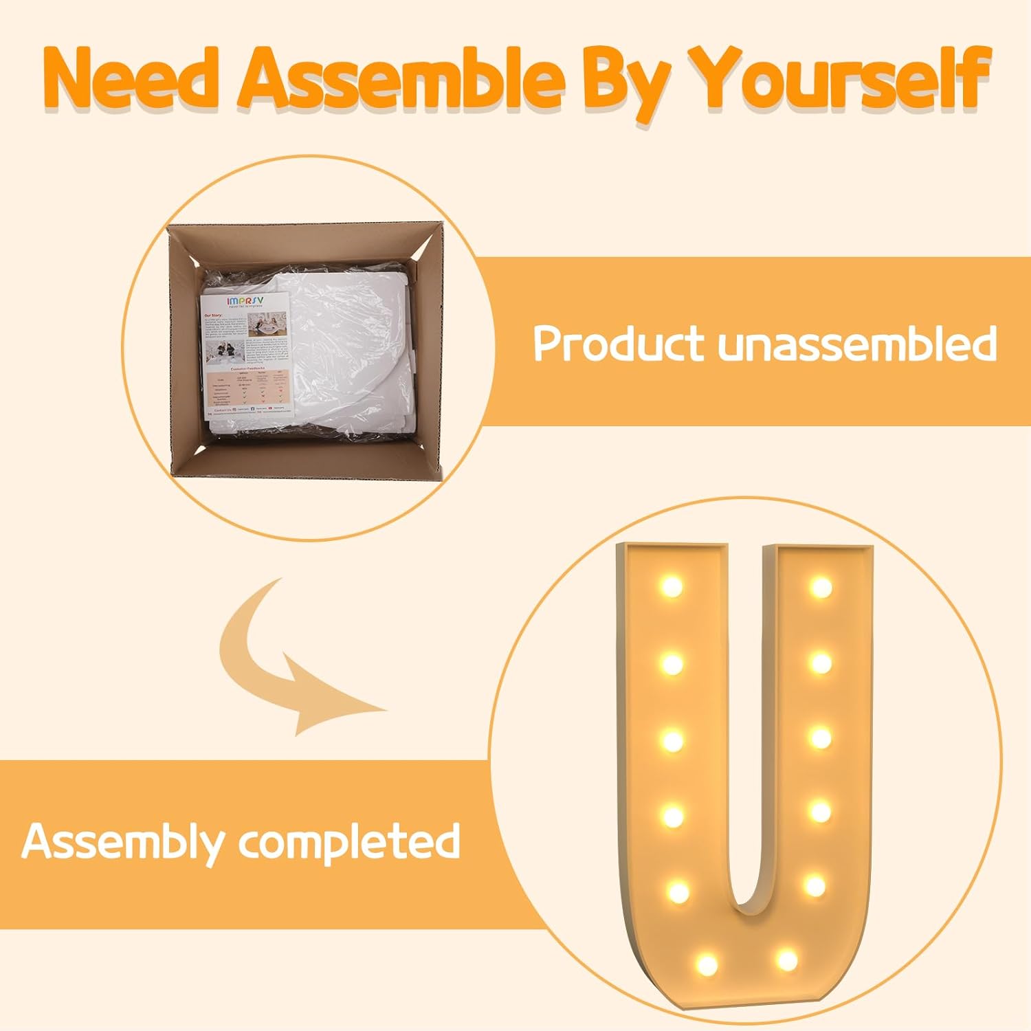 - Assembly Required: Our large marquee letters is made from foam board and easy to assemble with our splicing mode. Just follow the numbered instructions to align and insert the bottom plate, and reinforce it with a hot glue gun. Then, you're done!