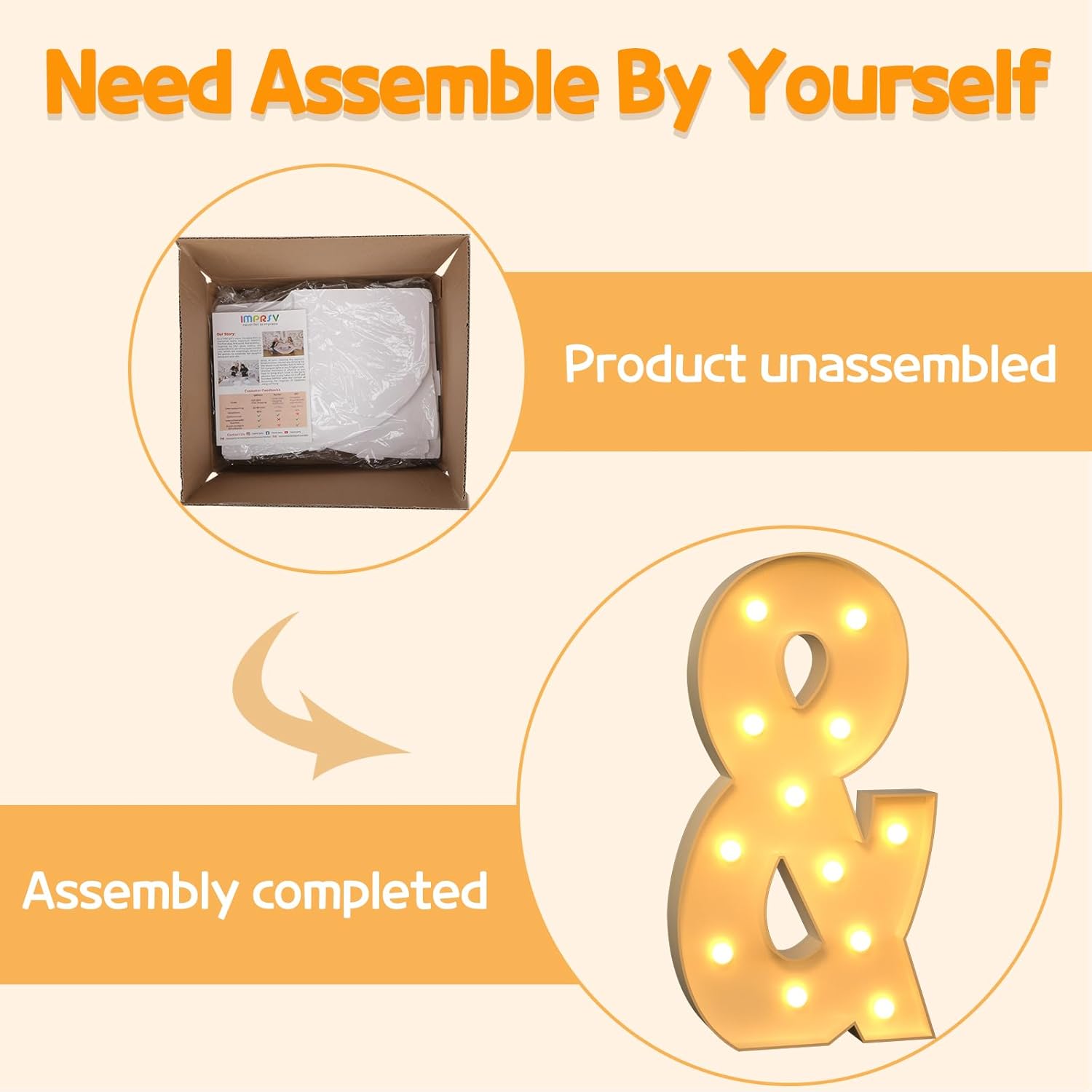 - Assembly Required: Our large marquee letters is made from foam board and easy to assemble with our splicing mode. Just follow the numbered instructions to align and insert the bottom plate, and reinforce it with a hot glue gun. Then, you're done!