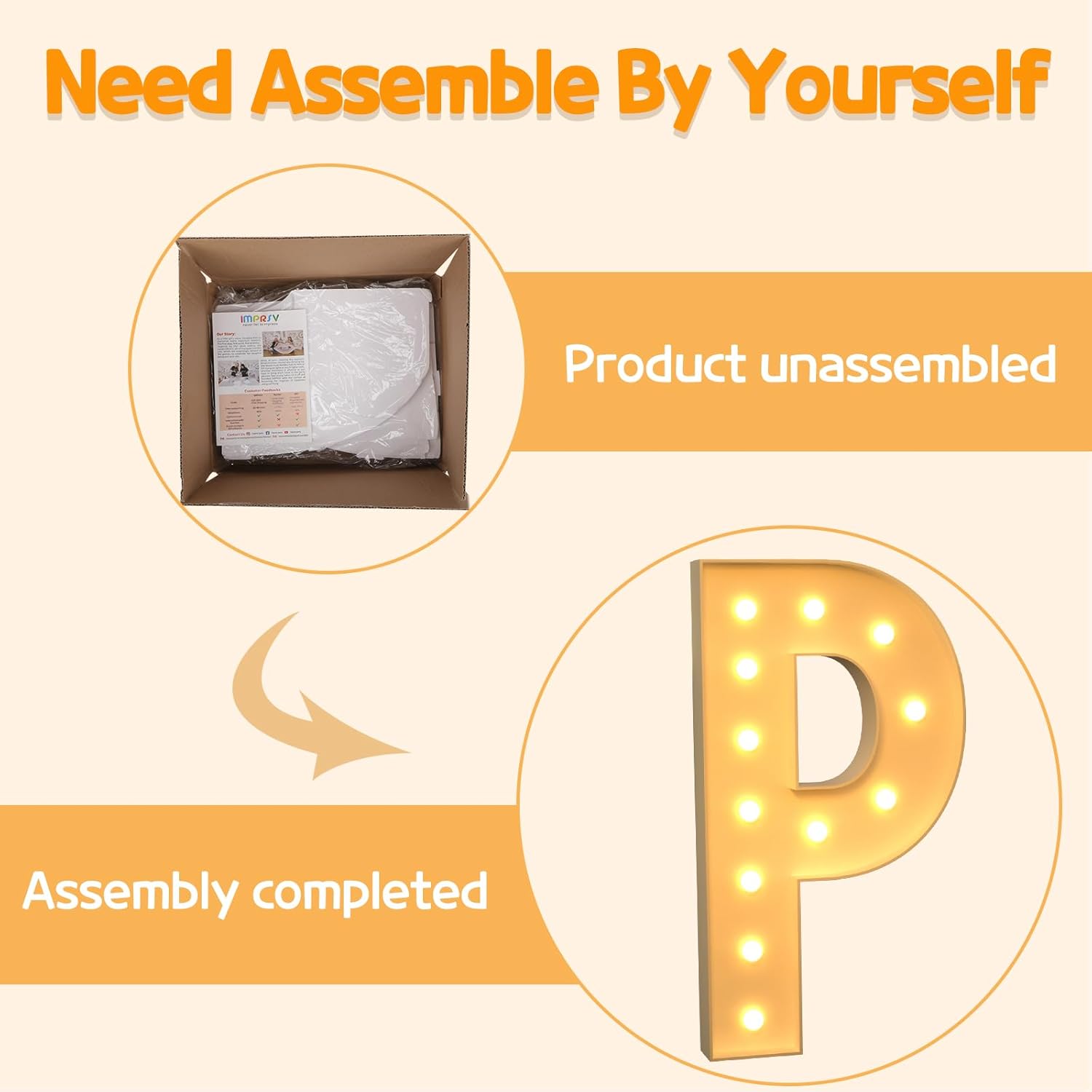 - Assembly Required: Our large marquee letters is made from foam board and easy to assemble with our splicing mode. Just follow the numbered instructions to align and insert the bottom plate, and reinforce it with a hot glue gun. Then, you're done!