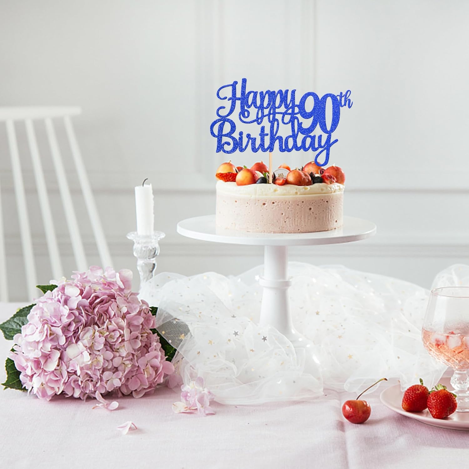 1 PCS Happy 90th Birthday Cake Topper Glitter Cheers to 90 Years Birthday Cake Pick Ninety 90 Fabulous Cake Decoration for Happy 90th Birthday Theme Party Decorations Supplies Blue