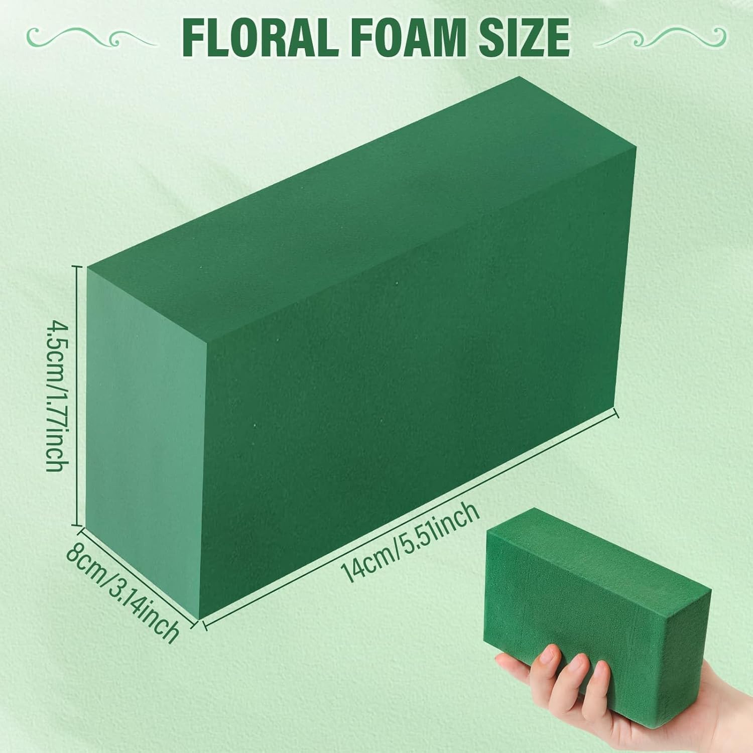 - Floral Foam Size – The green foams for flower arrangements are with small size of 5.5"L x 3.1"W x 1.7"H. The flower foam blocks cut and shape easily after absorbing enough water, you can cut it into different shapes & sizes