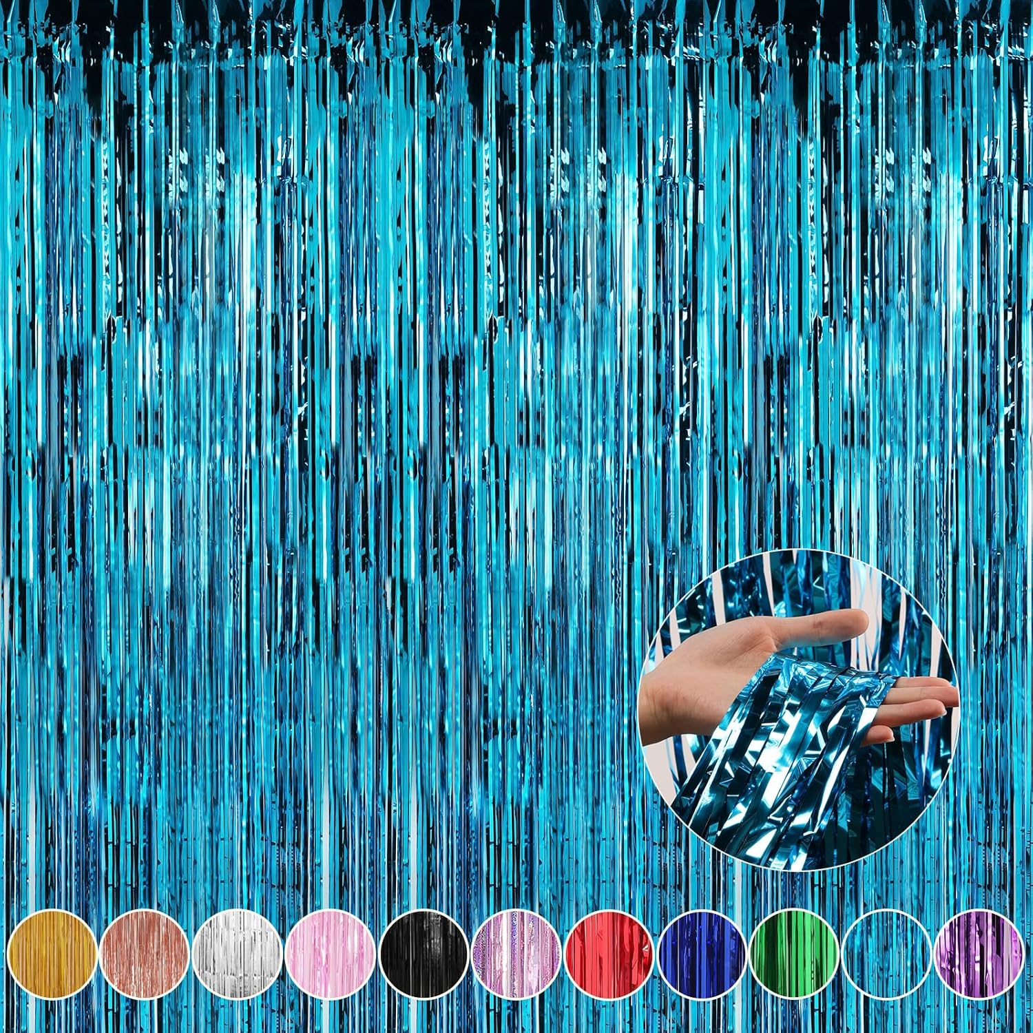 Crosize 4 Pack 3.3 x 9.9 ft Foil Fringe Curtains Party Decorations, Blue Tinsel Curtain Backdrop for Parties, Door Streamers, Glitter Streamer Fringe Backdrop for Birthday Decoration (Blue)