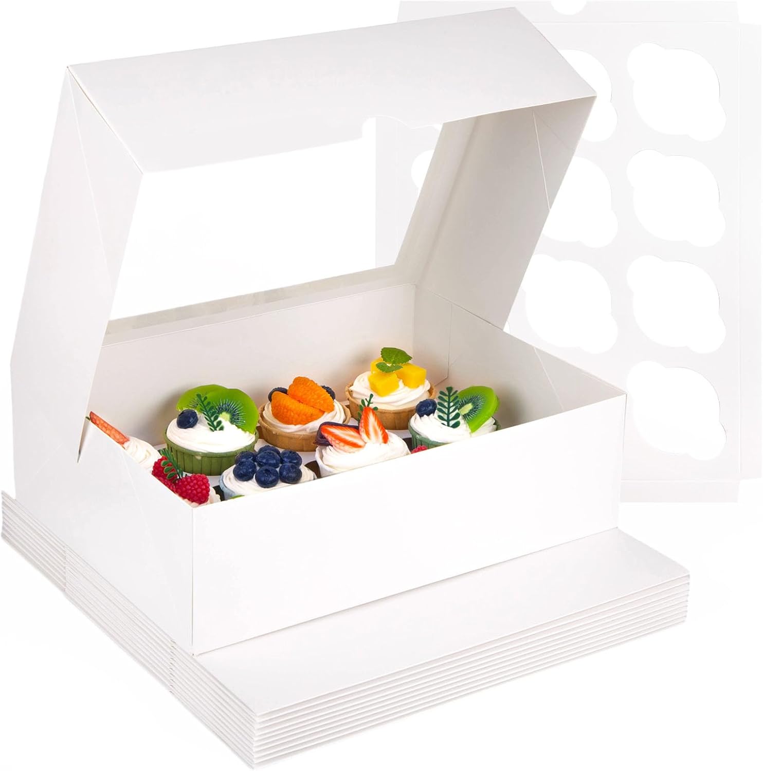 - Bountiful Pack: You’ll receive 12 white cupcake boxes along with 12 matching inserts. Cupcake box dimensions (assembled): 13.2" x 9.8" x 4". Each box arrives flat and folds together easily along pre-creased lines—no adhesive or tools needed