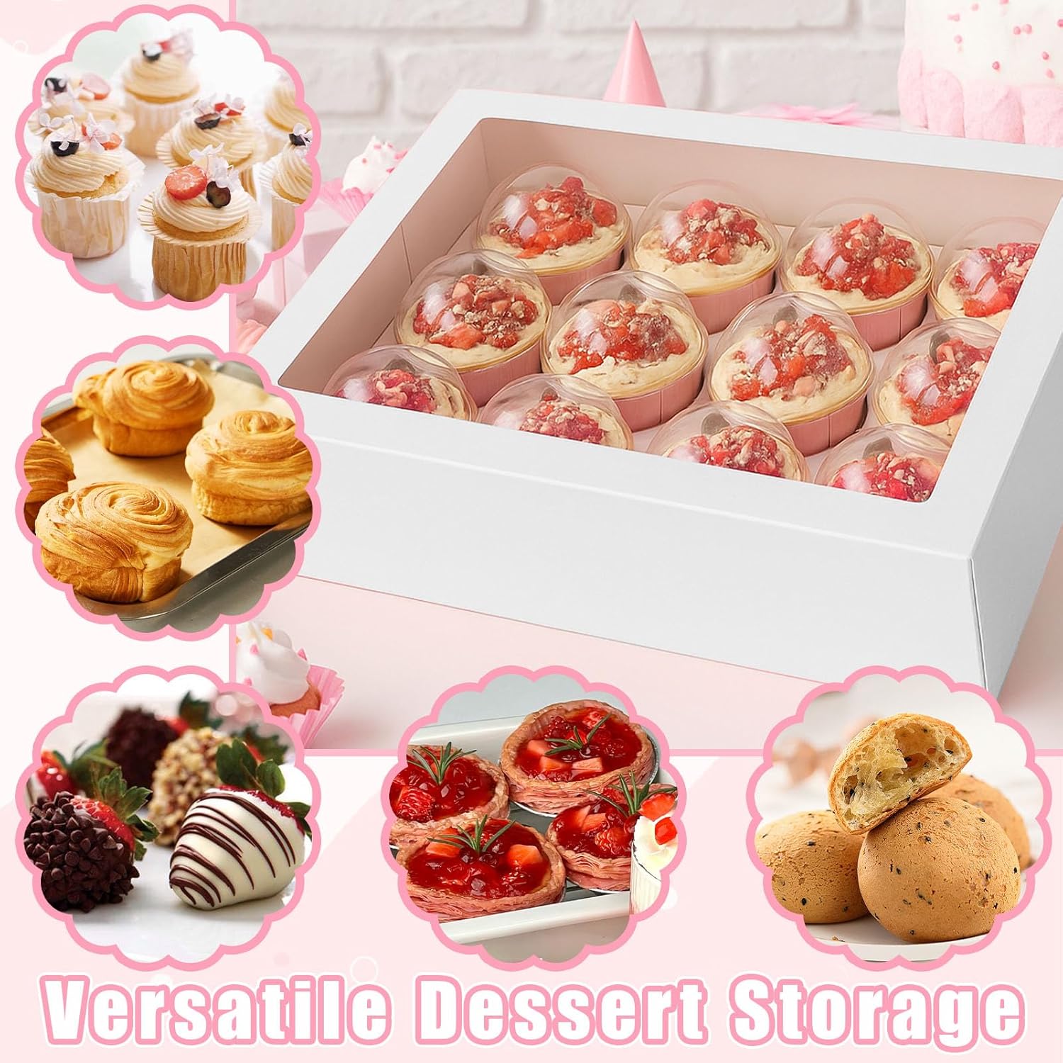- Multi-Purpose Storage: Each pastry box fits 12 regular-sized cupcakes with the insert in place. Remove the insert to transform the cupcake box into a versatile container for cookies, muffins, mini cakes, mochi, chocolate strawberries, or other pastries—great for any sweet treat