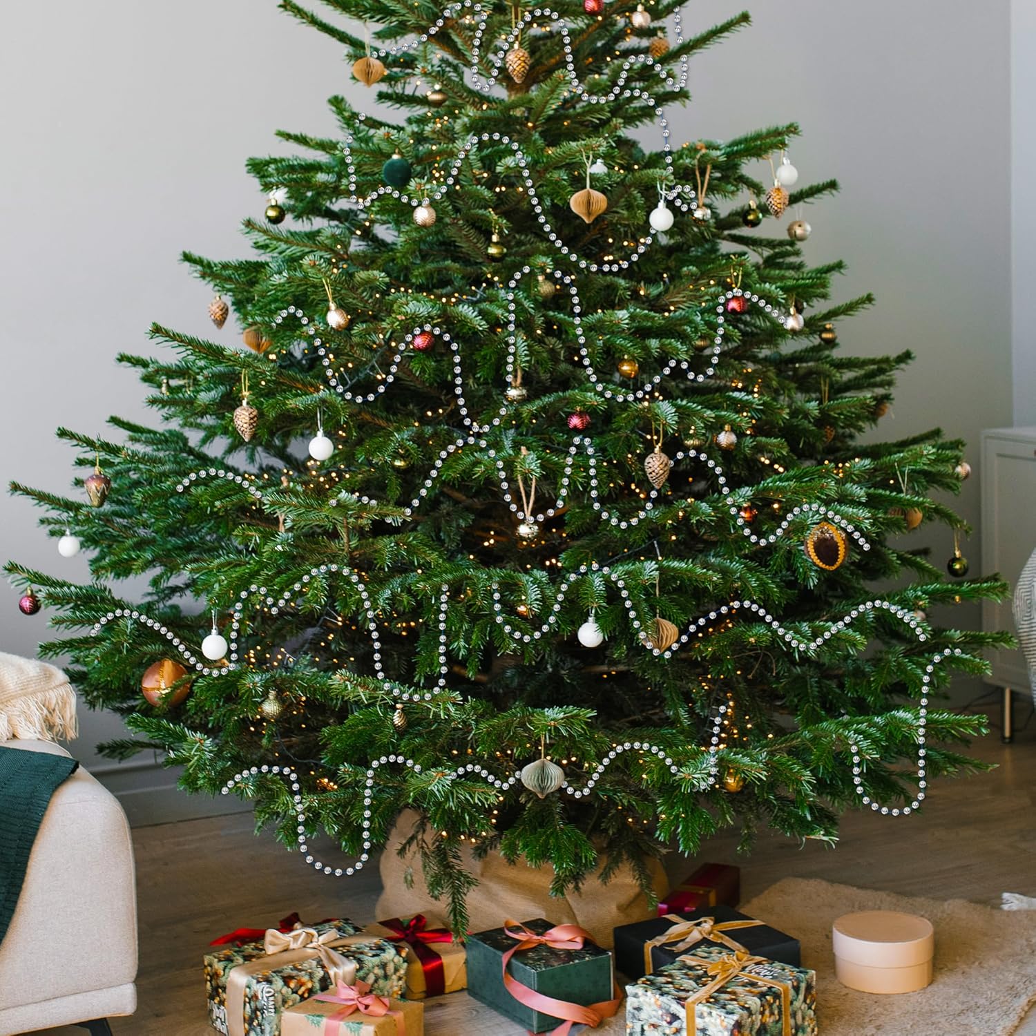 - Sizable Length - The Christmas tree bead chain measures 100 feet in length. Each bead has a size of 0.24 inches. With their ample length and perfect size, they effortlessly drape and adorn your tree.