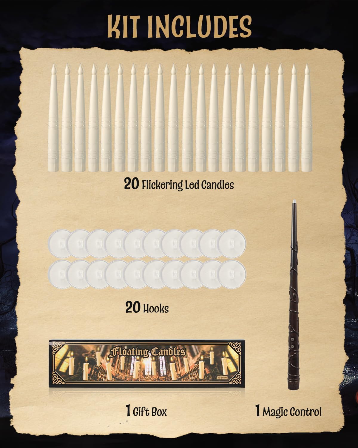 - Halloween Atmosphere Enhancement-Light up your Halloween with our set of 20 flickering flameless LED candles. Complete with a magic wand remote control, these candles bring the perfect spooky atmosphere to your indoor party. The transparent fishing line already wrapped around the candles gives them an eerie floating effect that will delight witches and wizards of all ages.