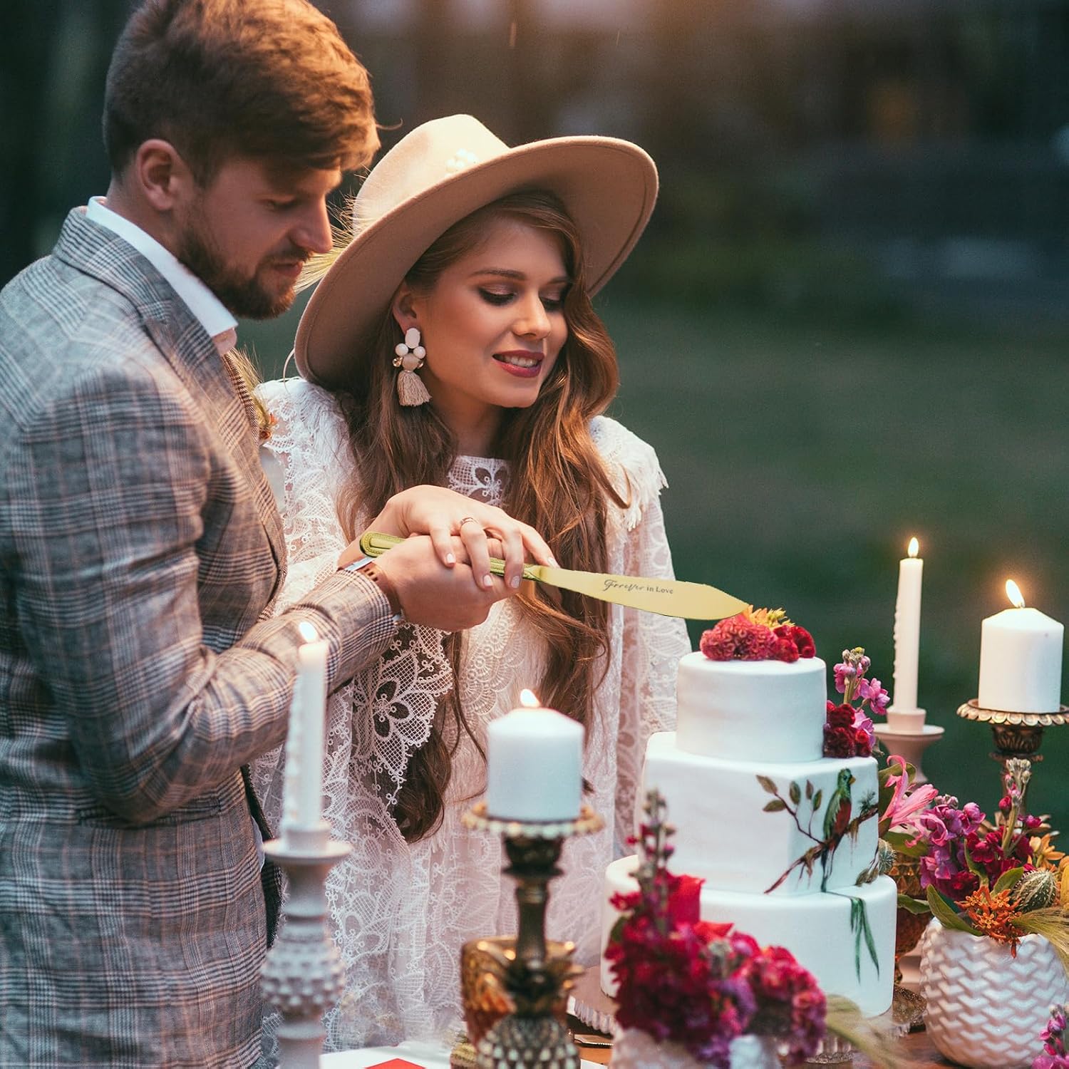 - Engraved Wedding Cake Knife and Server Set: This complete cake cutting set for wedding features golden elegance with engraved details like “Mr and Mrs” and “Happily Ever After,” making your ceremony even more memorable