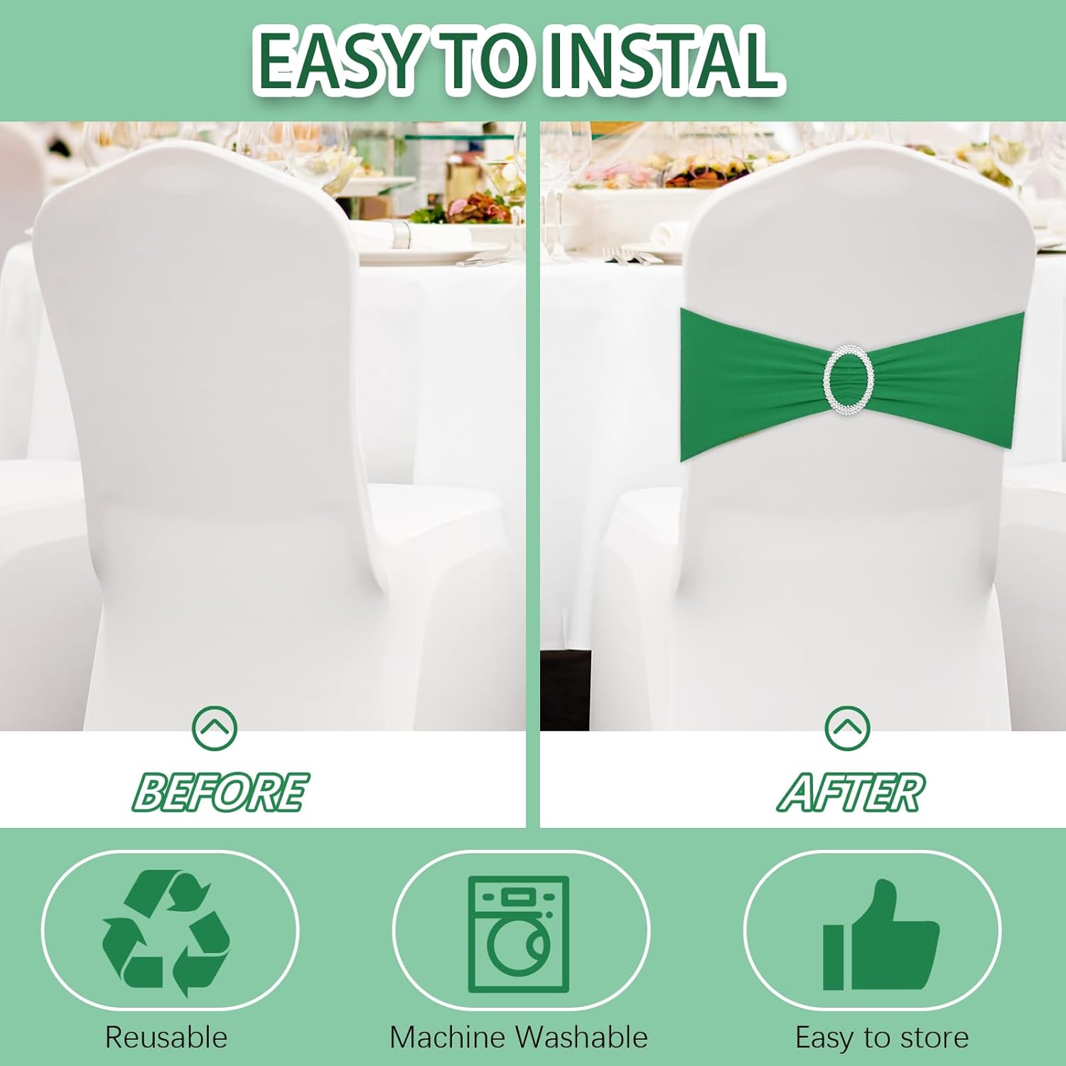 CHENGU 150 Pieces Spandex Stretch Chair Sashes Bows Elastic Chair Cover Bands Ties with Buckle Slider for Wedding Party Reception Events Universal Ceremony Banquet Decorations (Green)