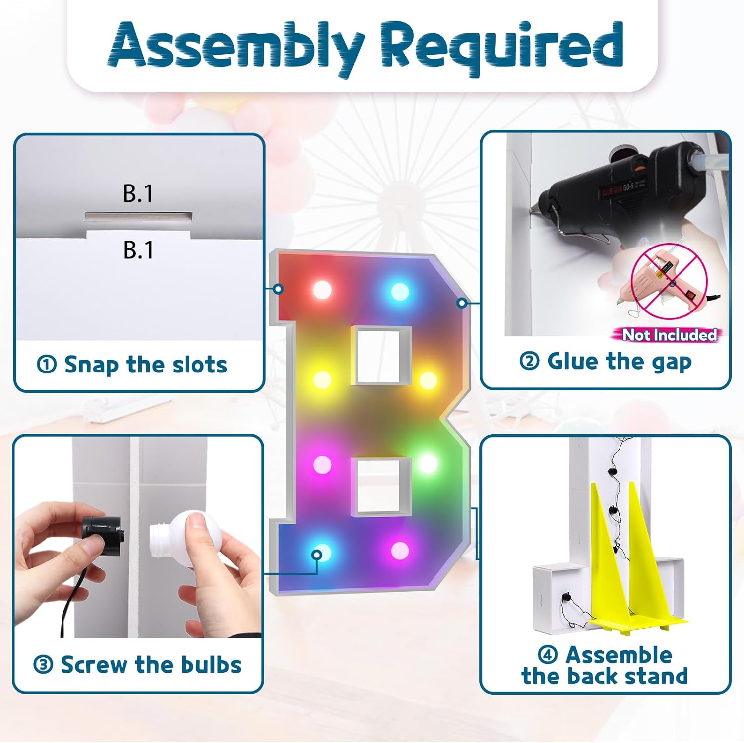 - Assembly Required. To assemble the light up numbers and letters, a hot glue gun is necessary. We have conveniently pre-cut the numbers into several pieces for your convenience. Simply consult the included instruction manual to easily assemble the impressive 4 ft tall and 3ft tall marquee numbers and letters using a hot glue gun.