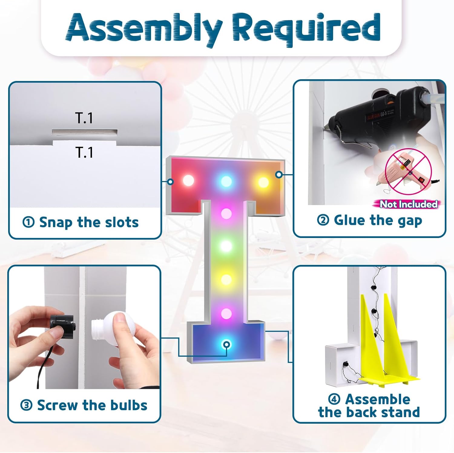 - Assembly Required. To assemble the light up numbers and letters, a hot glue gun is necessary. We have conveniently pre-cut the numbers into several pieces for your convenience. Simply consult the included instruction manual to easily assemble the impressive 4 ft tall and 3ft tall marquee numbers and letters using a hot glue gun.