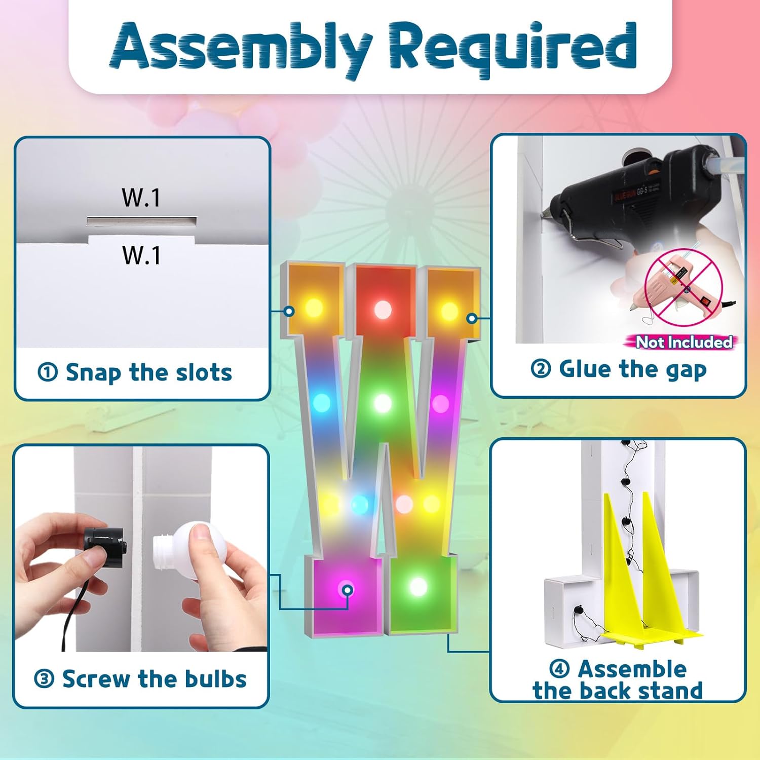 - Assembly Required. To assemble the light up numbers and letters, a hot glue gun is necessary. We have conveniently pre-cut the numbers into several pieces for your convenience. Simply consult the included instruction manual to easily assemble the impressive 4 ft tall and 3ft tall marquee numbers and letters using a hot glue gun.