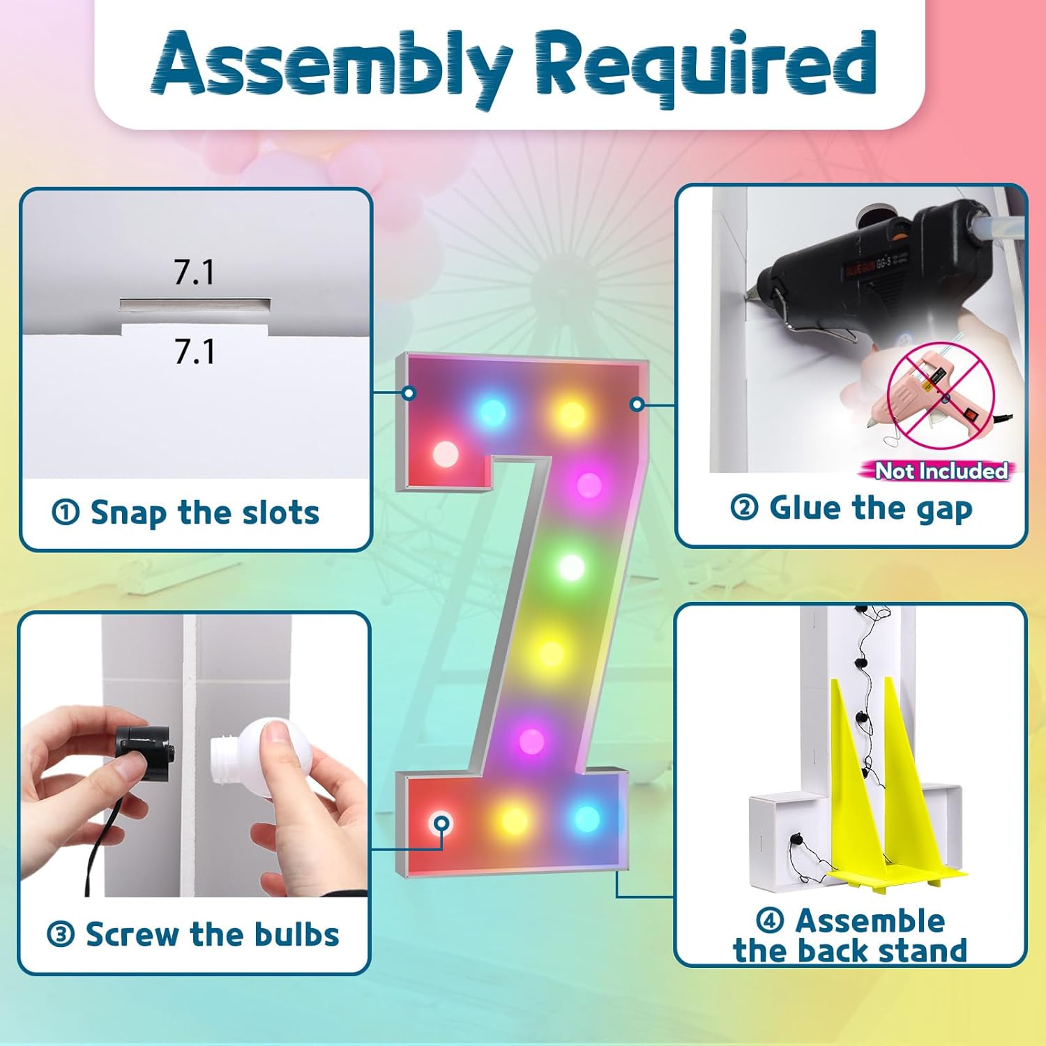 - Assembly Required. To assemble the light up numbers and letters, a hot glue gun is necessary. We have conveniently pre-cut the numbers into several pieces for your convenience. Simply consult the included instruction manual to easily assemble the impressive 4 ft tall and 3ft tall marquee numbers and letters using a hot glue gun.