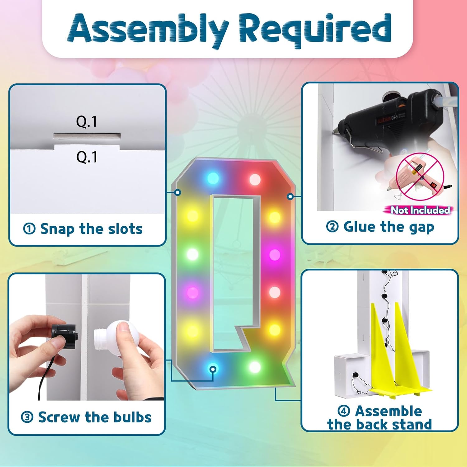 - Assembly Required. To assemble the light up numbers and letters, a hot glue gun is necessary. We have conveniently pre-cut the numbers into several pieces for your convenience. Simply consult the included instruction manual to easily assemble the impressive 4 ft tall and 3ft tall marquee numbers and letters using a hot glue gun.